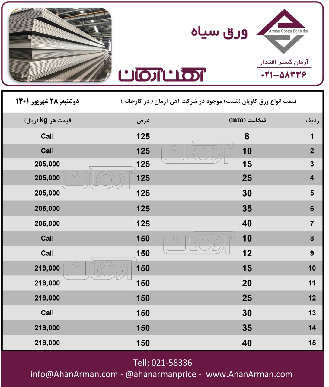 ورق سیاه کاویان ☎️۰۲۱-۵۸۳۳۶ داخلی 113 خانم طیبی 🌐www.ahanarman.com 🆔 @ahanarmanprice https://t.me/AhanArmanPrice