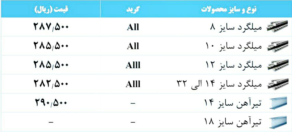 میلگرد سایز ۸ : ۱۶۴۵۰ تومان میلگرد سایز ۱۰،۱۲ : ۱۶۲۵۰ تومان میلگرد سایز ۱۴ تا ۳۲ : ۱۵۹۵۰ تومان تیرآهن سایز ۱۴ : ۱۶۰۰۰تومان