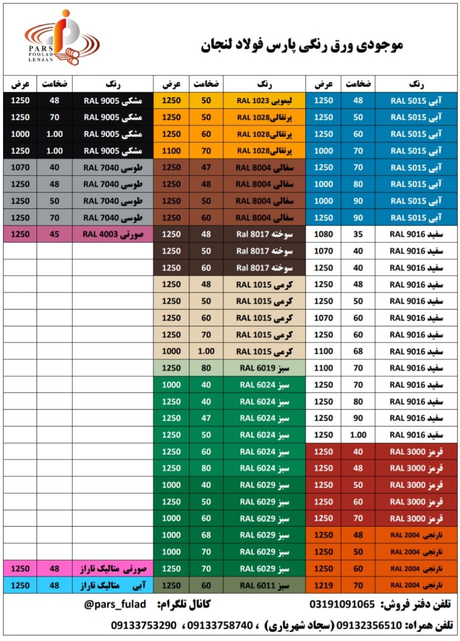 فروش ورق رنگي فولاد به صورت سبدي و جزئي 🔹دفتر فروش: ☎️ 031-910-910-65 📱 09132356510 (سجاد شهریاری) 📱 09133758740 (خانم صادقي)