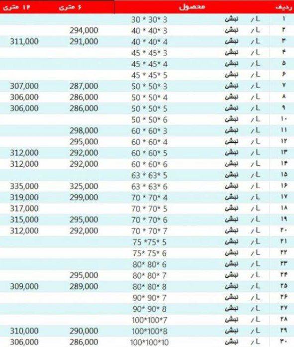 #آریان_فولاد نبشی 3*۴ »»285000««« نبشی ۴*۴ »»276500««« نبشی ۴*۵ »»———««« نبشی ۵*۵ »»275500««« نبشی ۶*۶ »»» 275500««« نبشی ۷*۷ »»283500««« نبشی ۸*۸»»»275500««« ...