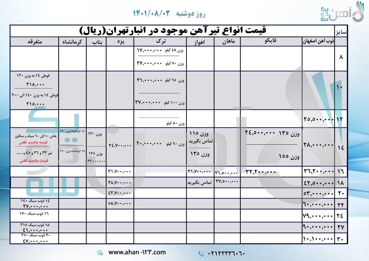 «آهن یک دو سه » چهارشنبه ۱۴۰۱/۰۷/۲۷ قیمت_میلگرد_فایکو انبار تهران میلگرد فایکو سایز ۱۴ الی ۳۲ قیمت: ١۵۶/۹۰۰ ریال