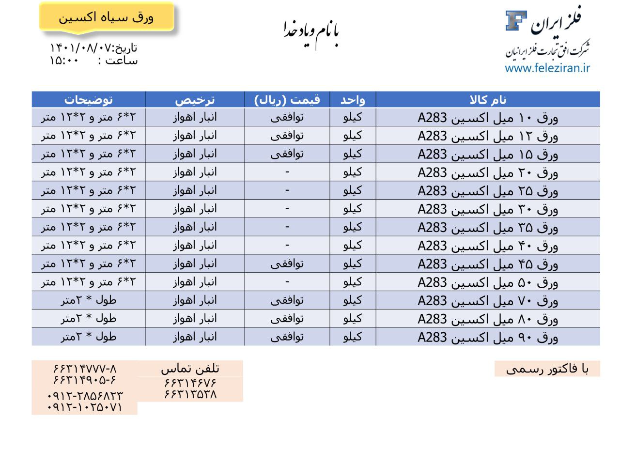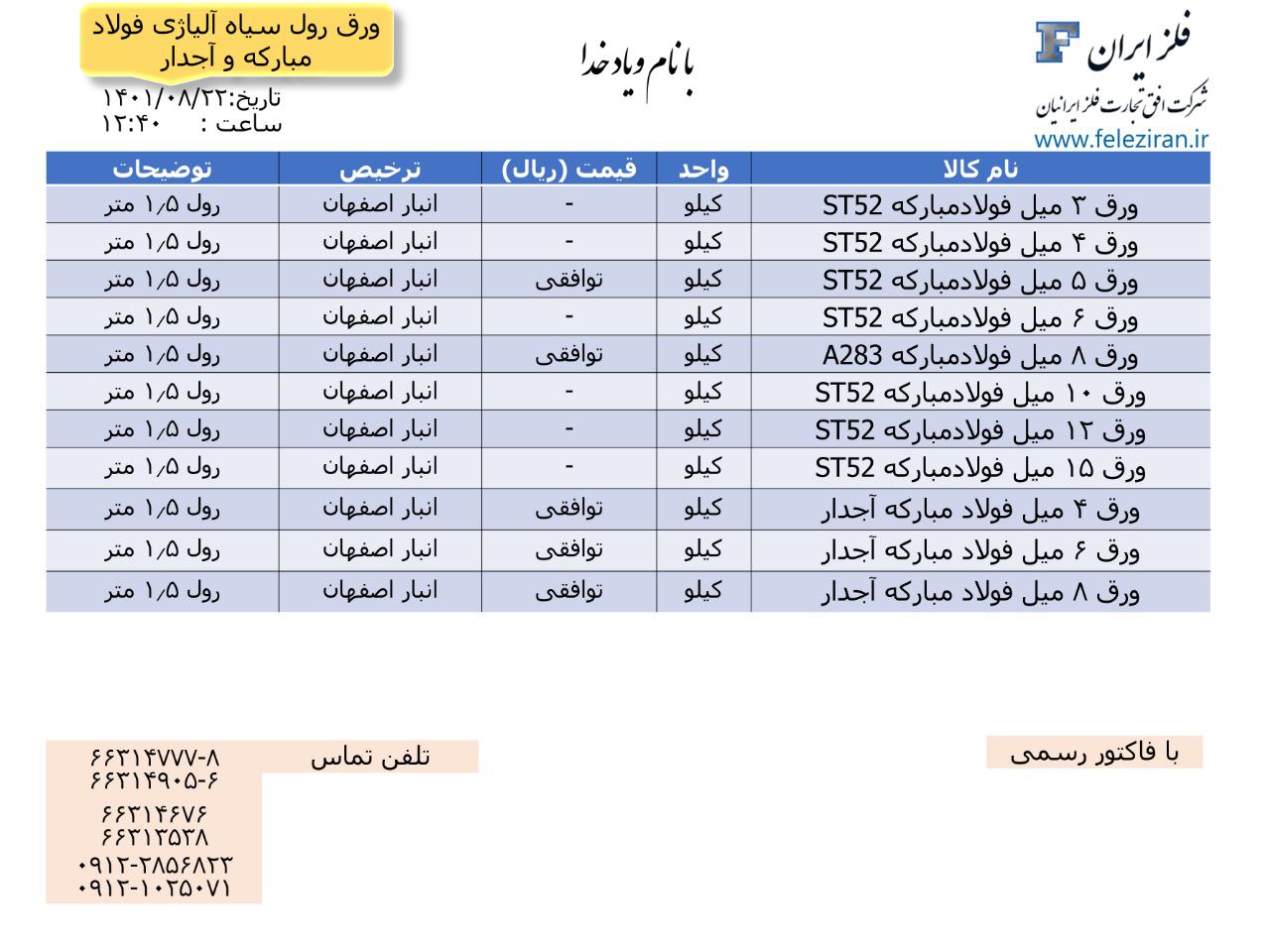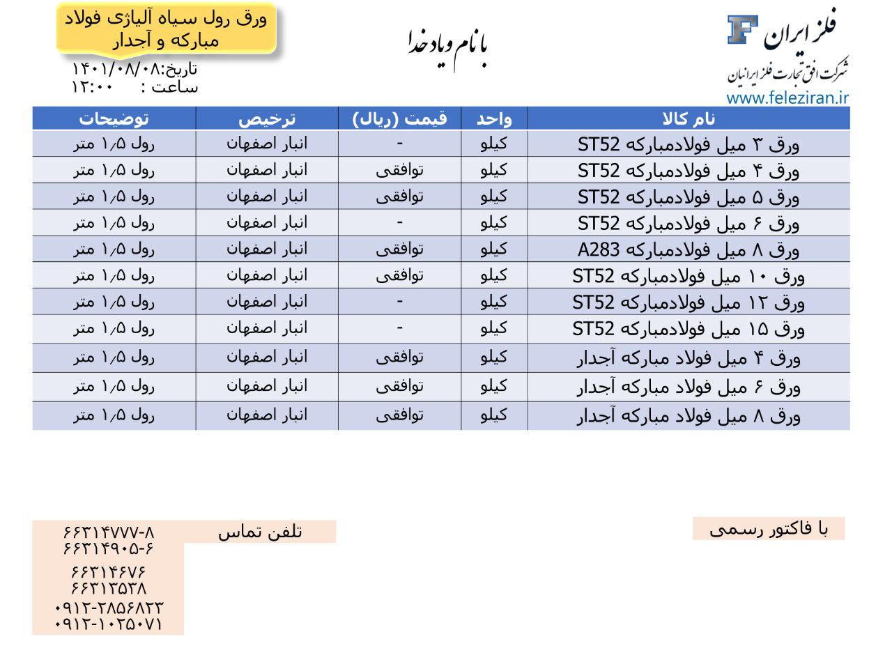 لیست موجودی ورق فابریک سیاه فولاد مبارکه