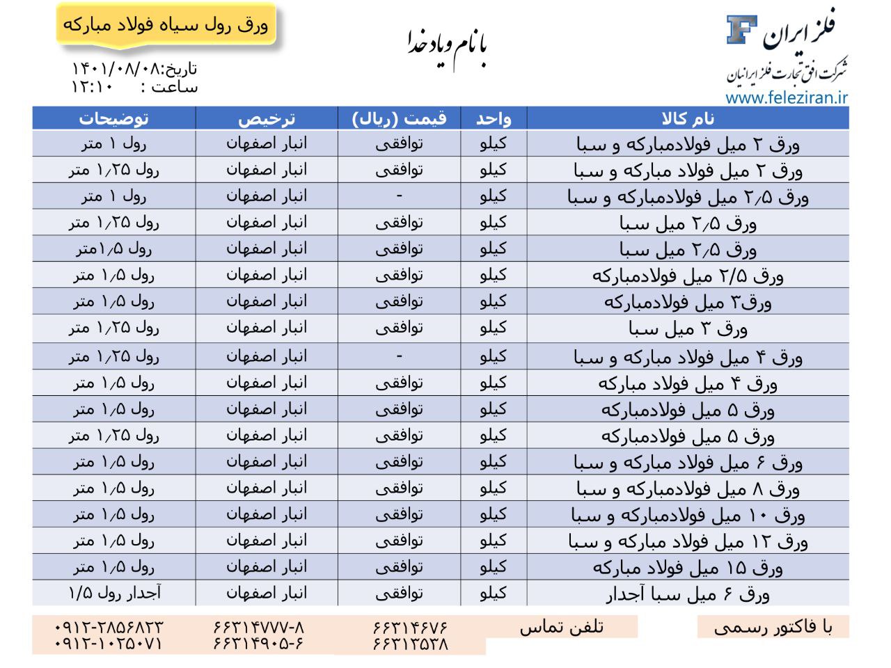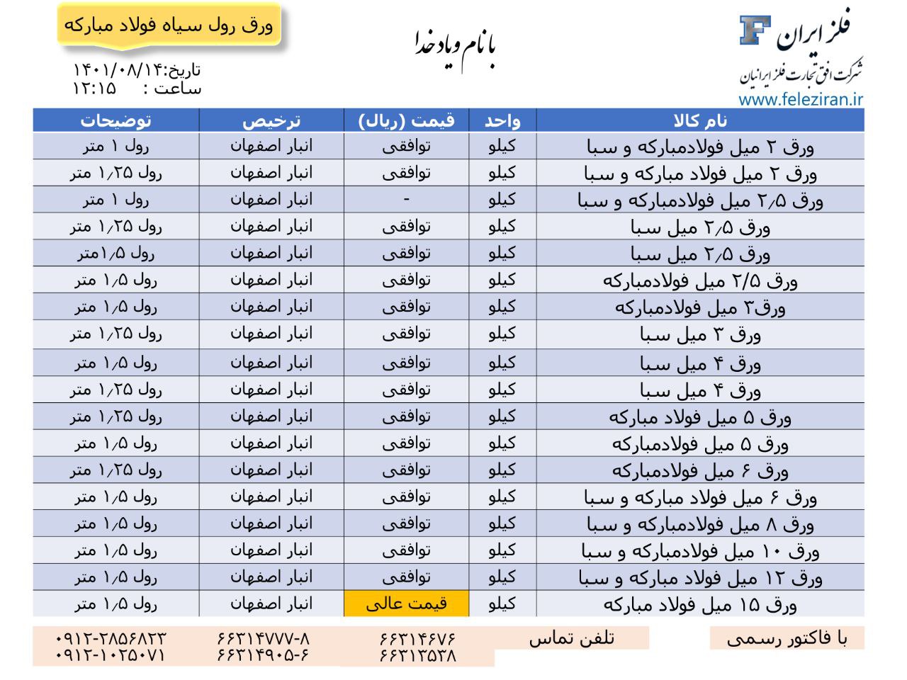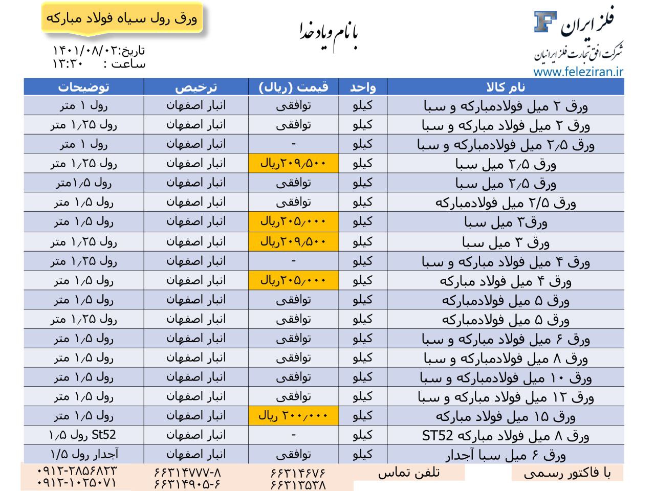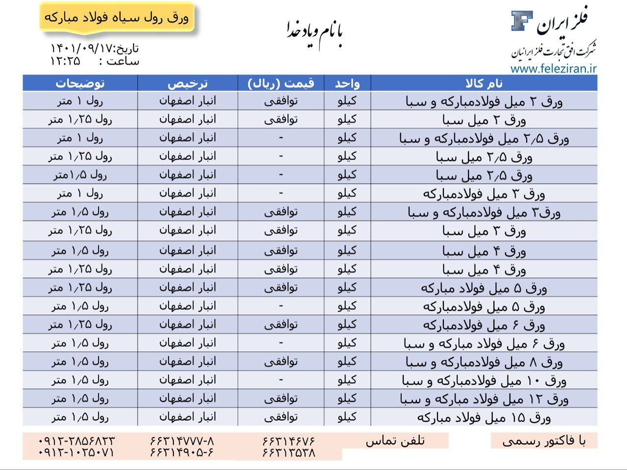 لیست موجودی و قیمت ورق رول سیاه مبارکه