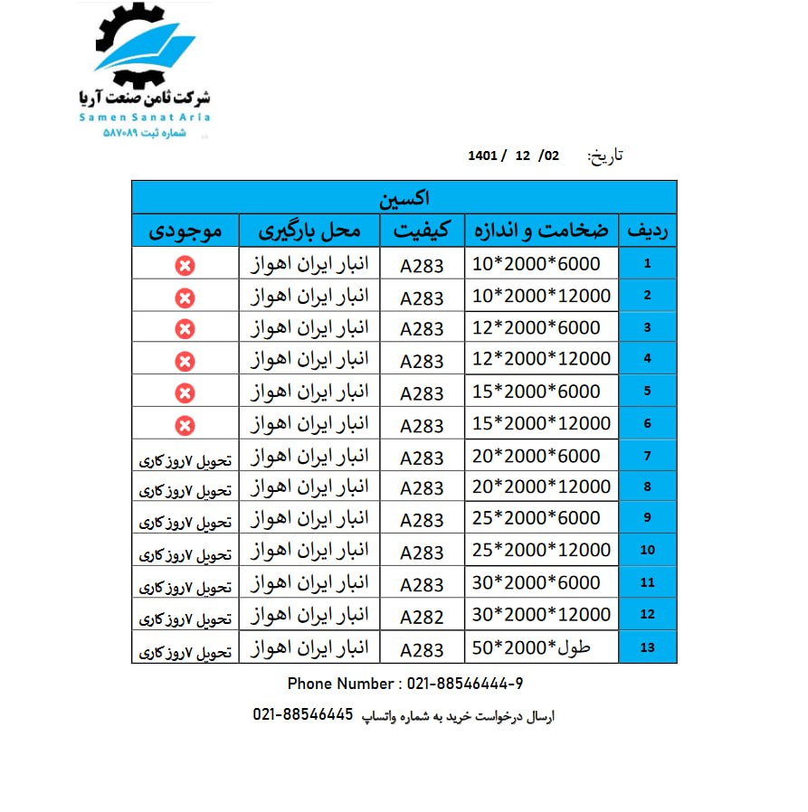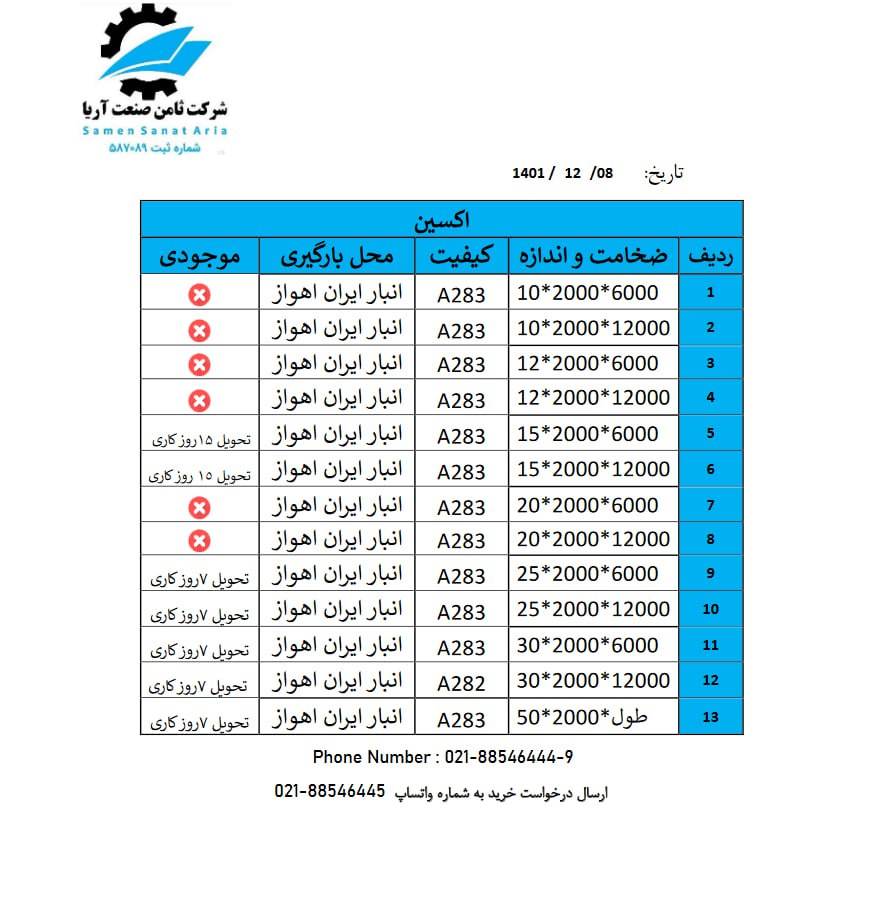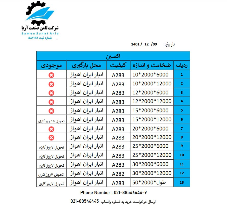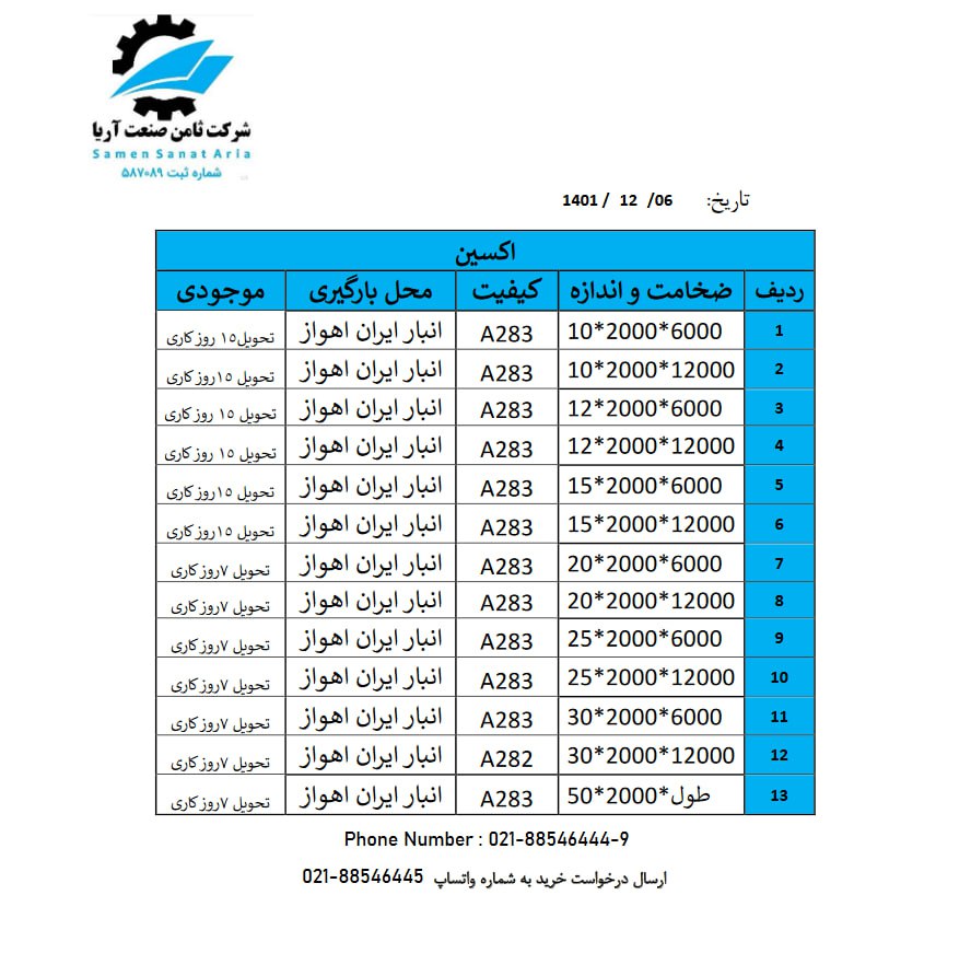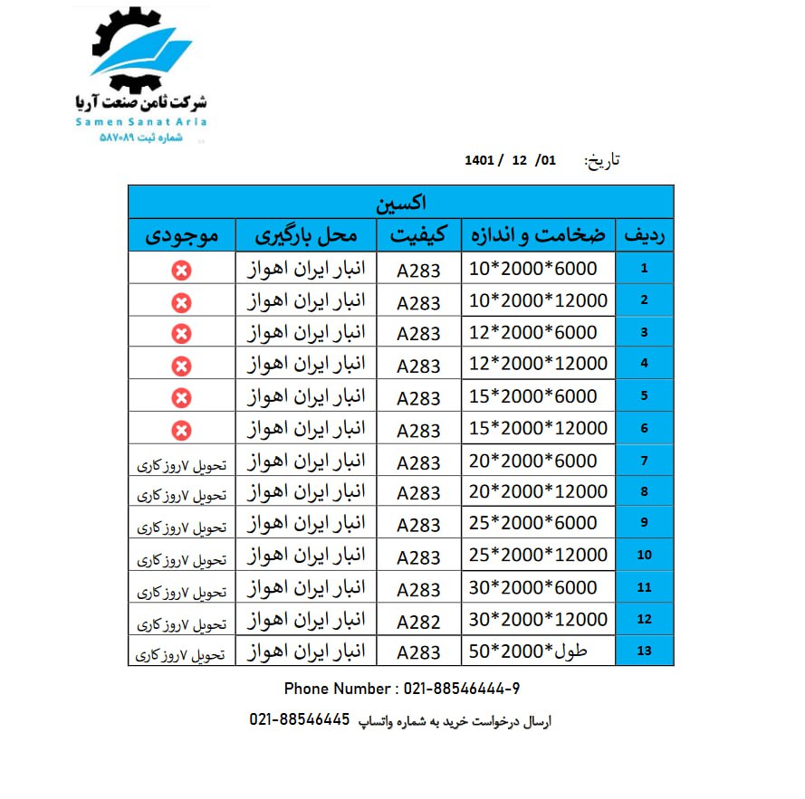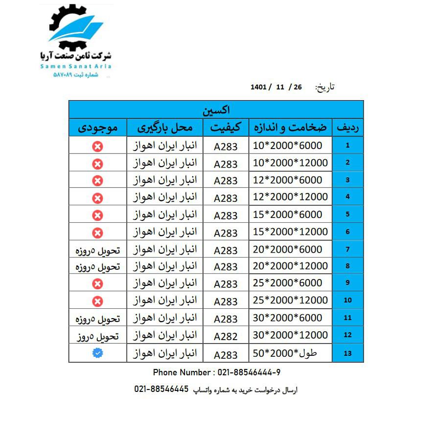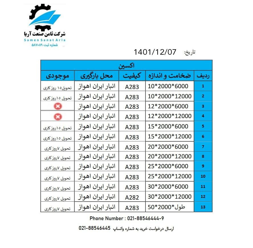 ورق اکسین A283 طول*2000*50 ------------------------------------------------- بورس انواع ورق صنعتی : سیاه (فولاد مبارکه ، اکسین ، گیلان) _ گالوانیزه و ورق رنگی _ ...