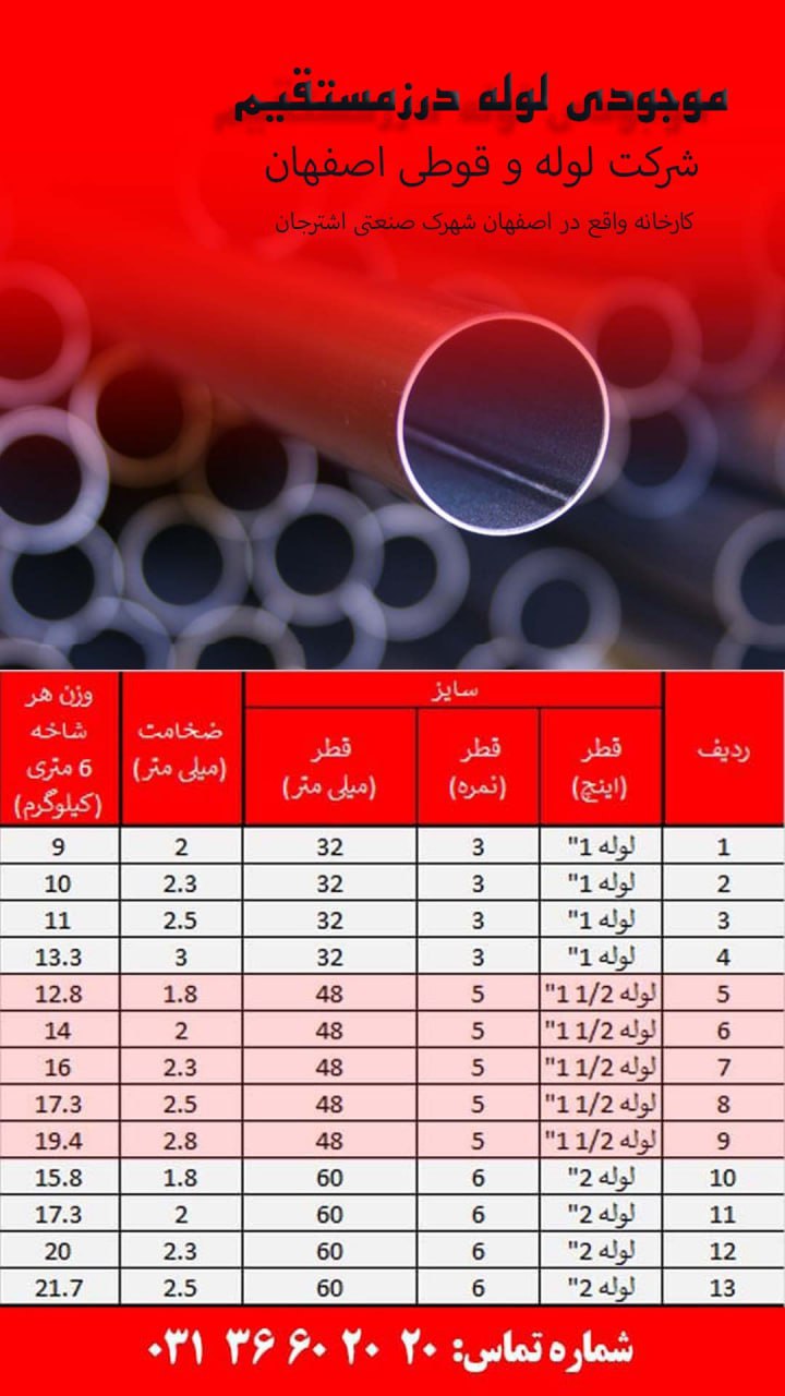 #شرکت_لوله_و_پروفیل_اصفهان شرکت لوله و قوطی اصفهان, 🔘لوله درز مستقیم 1 اینچ ( قطر 3 سانتی متر)🔘 ضخامت 1.8 = 38400 تومان / کیلوگرم ضخامت 2 = 38400 توما ...