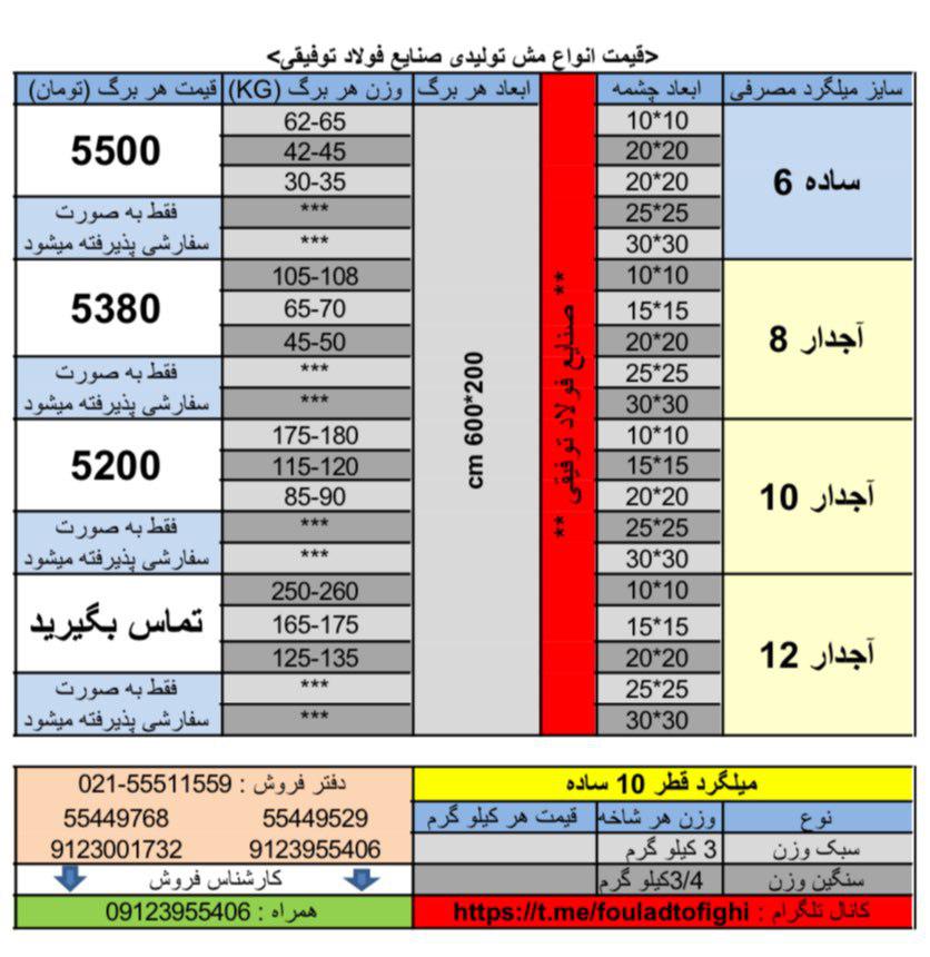 توری مش 8 و 10 فابريك در چشمه های 10 15 و 20 سفارشات پذيرفته مي شود صنایع فولاد توفیقی لطفا برای تایید قیمت نهایی با ما تماس بگیرید