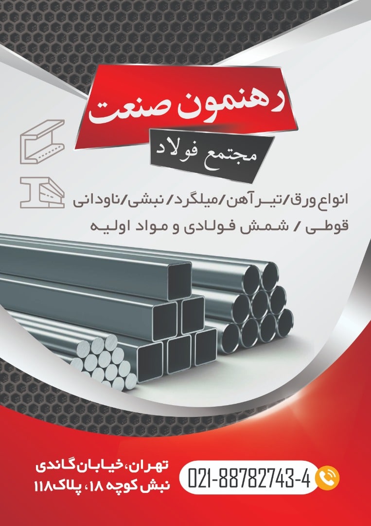 مجتمع فولاد رهنمون صنعت 🟡تأمین و توزیع انواع: 🔻مقاطع فولادی 🔻انواع میلگرد 🔻تیرآهن 🔻نبشی و ناودانی 🔻انواع ورق فولادی 🔻شمش فولادی و مواد اولیه تلفن ثابت: 887 ...