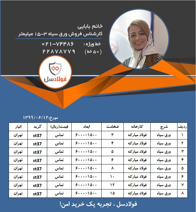 #فولادسل #ورق_سیاه کارشناس فروش: خانم بابایی تماس: 09919597404 شرکت: 02174486 داخلی 103 @fooladsell قیمت روزانه ورق سیاه 315 میل