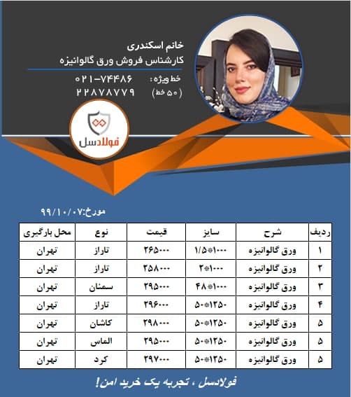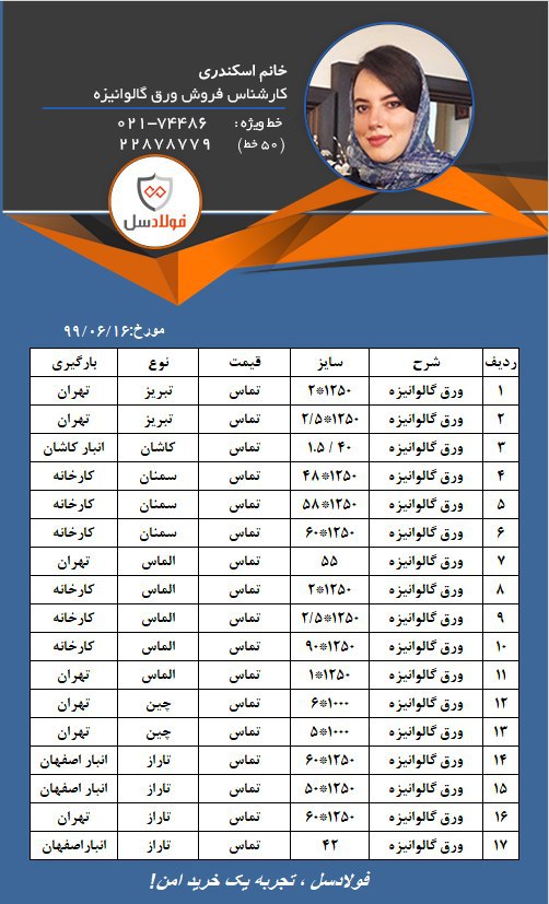 #ورق_گالوانیزه #فولادسل کارشناس فروش:اسکندری شماره تلفن:02174486 داخلی107 شماره تماس:09919597412