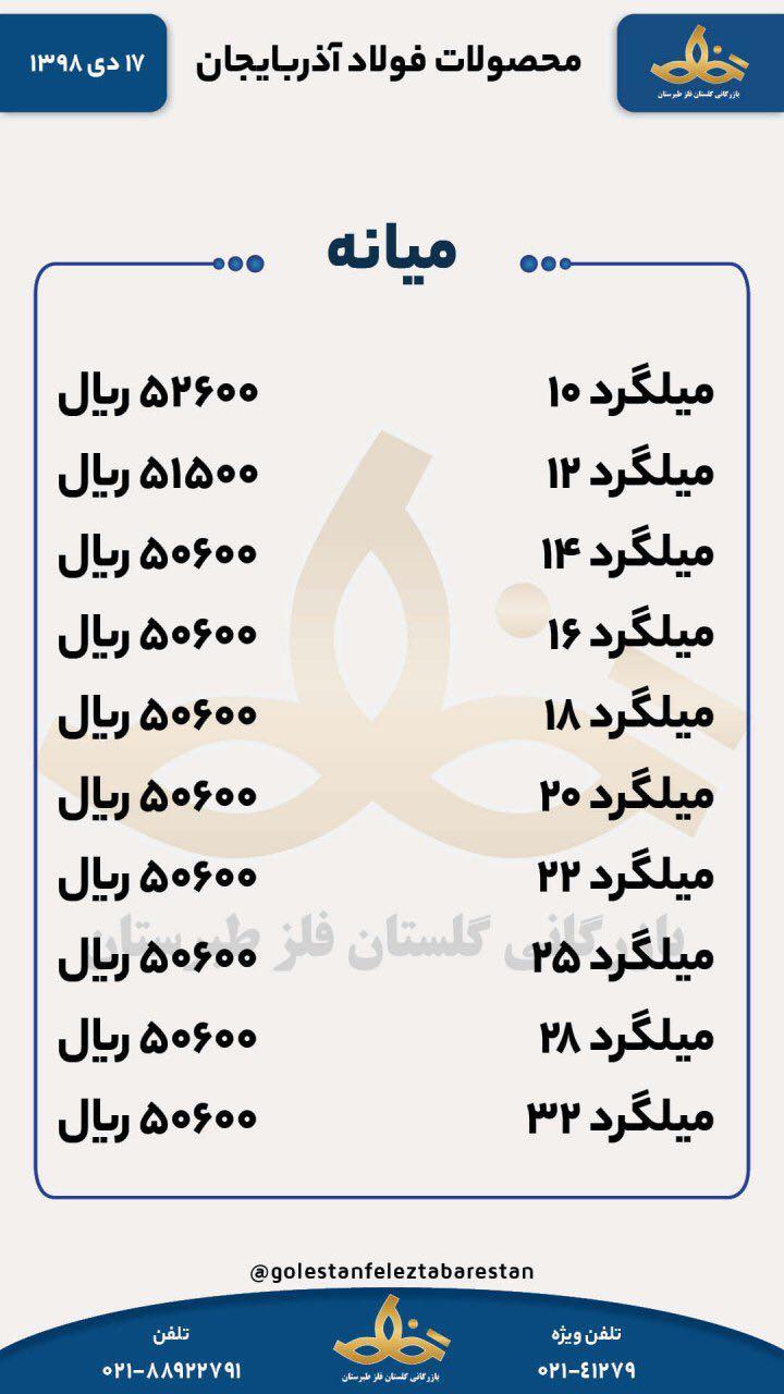 محصولات فولاد #میانه* میلگرد ۱۰ : ۴۸۹۰۰ میلگرد ۱۲ : ۴۷۷۰۰ میلگرد ۱۴ : ۴۷۲۰۰ میلگرد ۱۶ : ۴۷۲۰۰ میلگرد ۱۸ : ۴۷۲۰۰ میلگرد ۲۰ : میلگرد ۲۲ : ۴۷۲۰۰ میلگرد ۲۵ ...