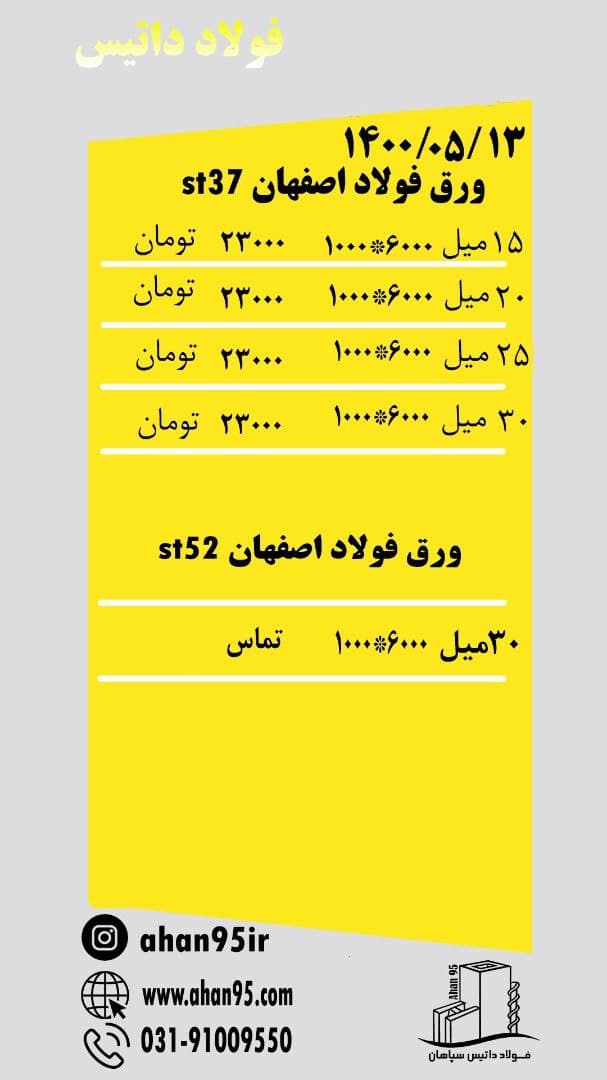 [ Photo ] 📆شنبه 1400/05/16 #ورق_فولاد_اصفهان 📈 500 تومان افزایش قیمت ❗️بارگیری از کارخانه ❗️ ☎️ 031-91009550 ☎️ 09136355004 داخلی 200 و 201 برای ...