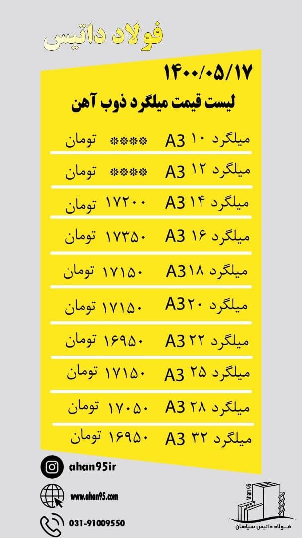 📆 یکشنبه 1400/05/17 #میلگرد_ذوب_آهن 📉 کاهش قیمت ❗️بارگیری از انبار و کارخانه ❗️ ☎️ 031-91009550 ☎️ 09136355004 داخلی 200 و 201
