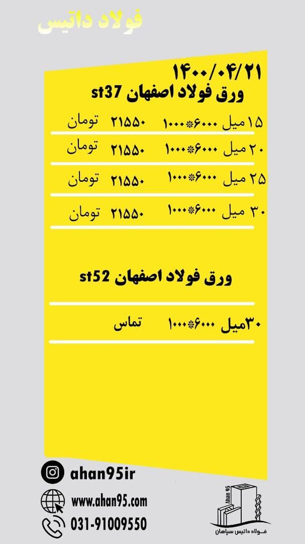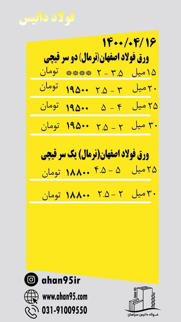 [ Photo ] 📅پنج شنبه 1400/04/17 #ورق 📛موجودی ورق 📛 ❗️بارگیری از انبار تهران ❗️ برای مشاهده محصولات کلیک کنید ↪️ https://t.me/ahan95ir ↩️ ↪️ www.ahan9 ...