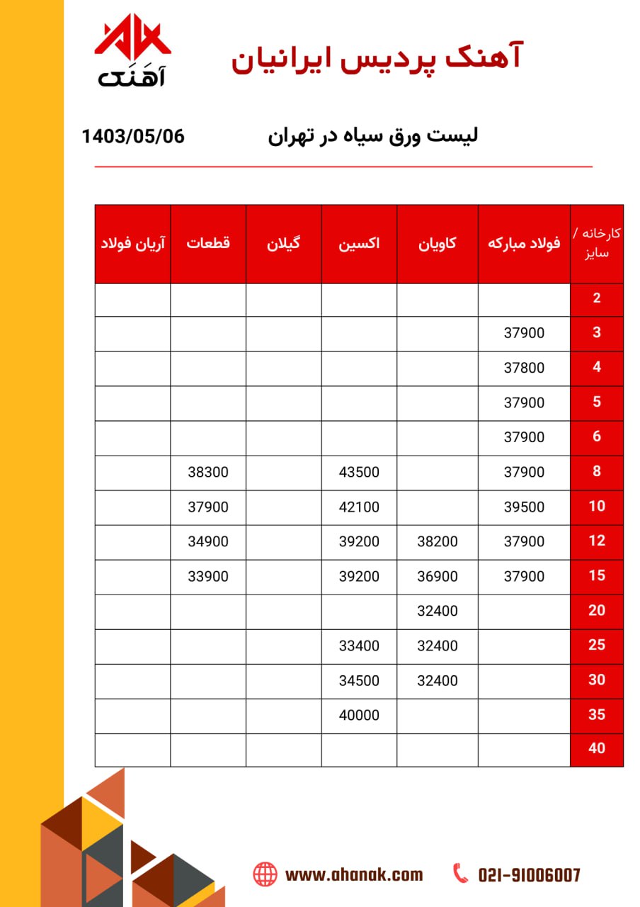 ⏱تاریخ :20 مرداد 1403 🔵 قیمت ورق سیاه 🔵 🏭 محل بارگیری تهران 📞 021-91006007 🌐 www.ahanak.com 🆔https://t.me/ahanak