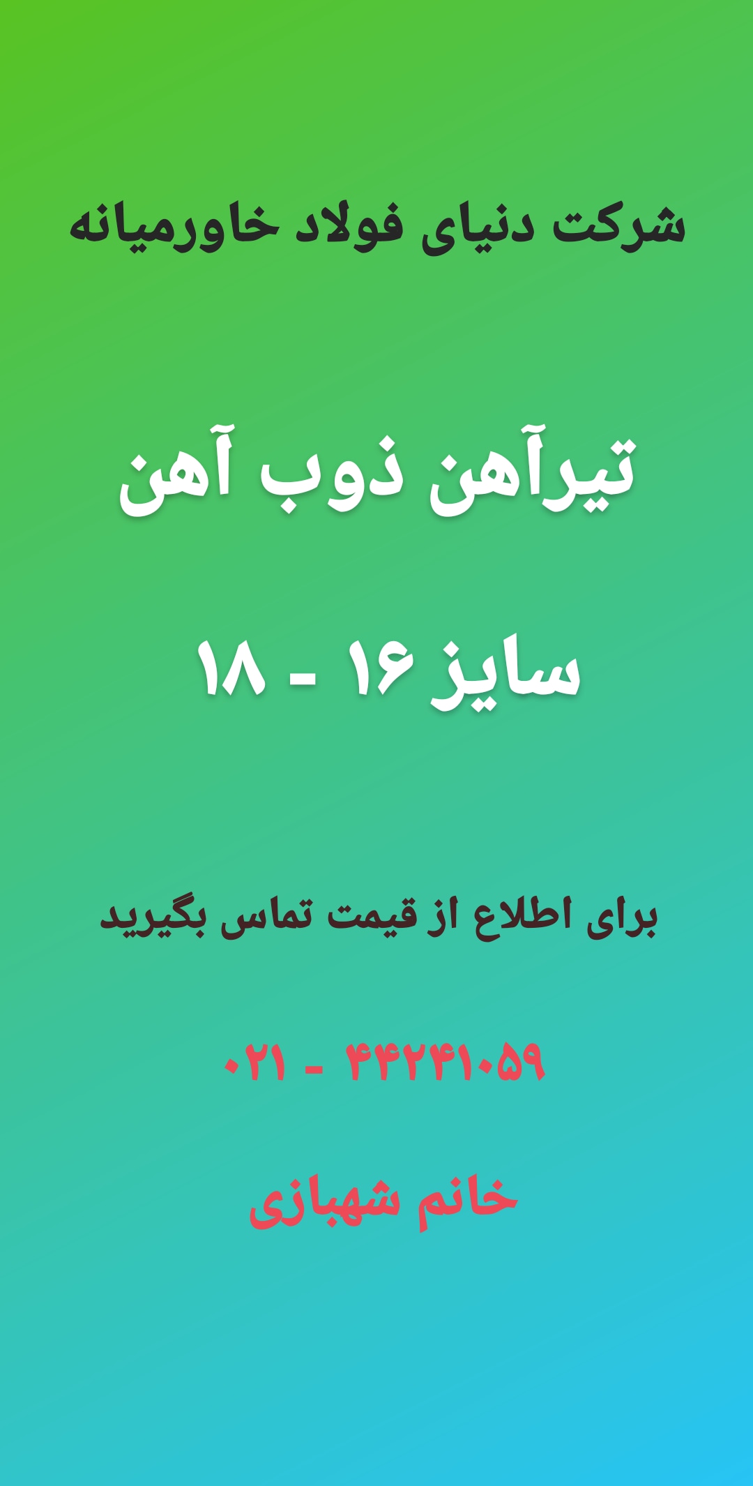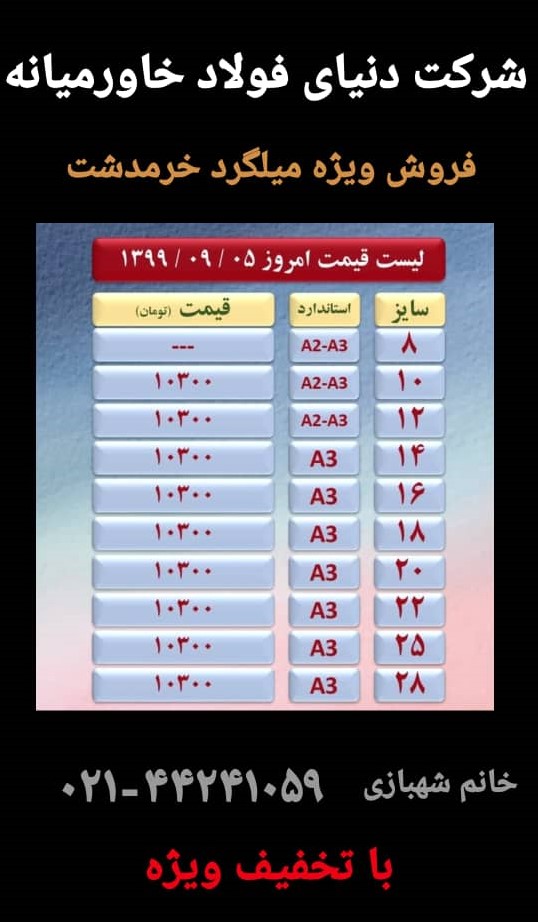 شرکت دنیای فولاد خاورمیانه ***** فروش میلگرد خرمدشت - شاهین بناب - بافق یزد - امیرکبیر - ذوب آهن - فایکو - حدیدسیرجان ***** تماس با ما : ۰۲۱۴۴۲۴۱۰۵۹ ۰۲۱۴۴۲۴۹۳۶ ...
