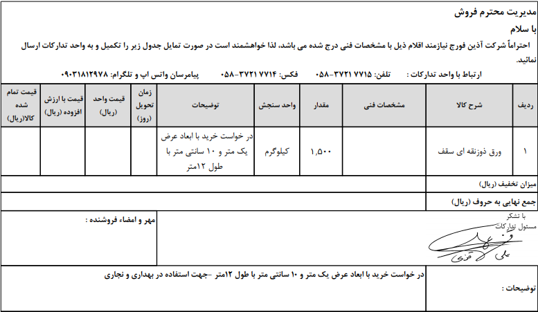 خریدار ورق ذوزنقه ای سقف مقدار 1500 کیلوگرم با ابعاد عرض یک متر و 10 سانتی متر با طول 12 متر