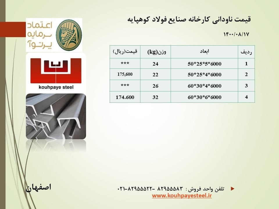 "فولاد کوهپایه تولید کننده انواع نبشی و ناودانی و سپری و تسمه محصولات این کارخانه شامل نبشی بال مساوی ، ناودانی، سپری، تسمه، چهارگوش و ریل آسانسور در ابعاد و . ...