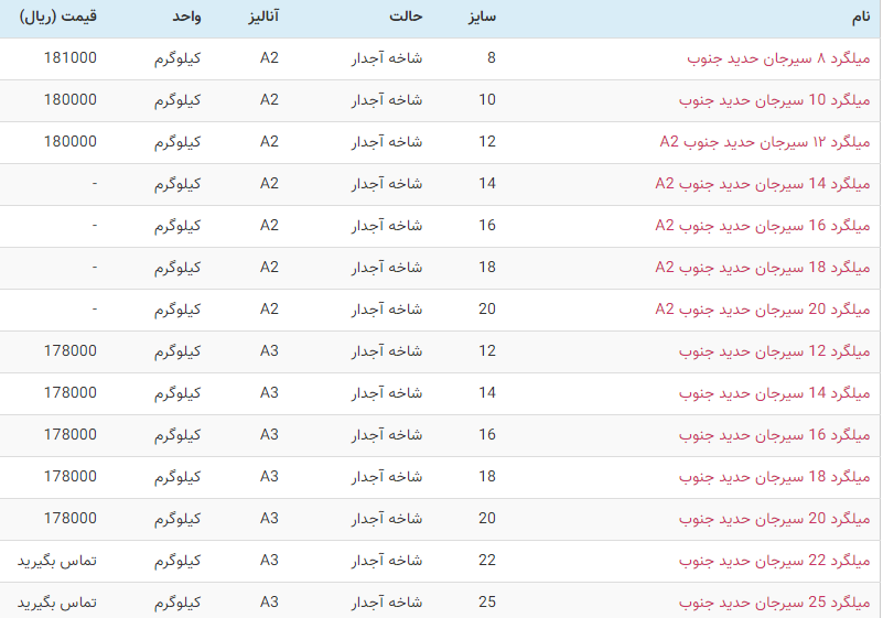 دوشنبه 4 مرداد ماه 1400 📢 #قیمت_میلگرد_آجدار_سیرجان_حدید_جنوب (نرخ دوم امروز) ⬆️ 100 تومان افزایش قیمت نسبت به ساعتی پیش بارگیری از کارخانه میلگرد 8 A ...