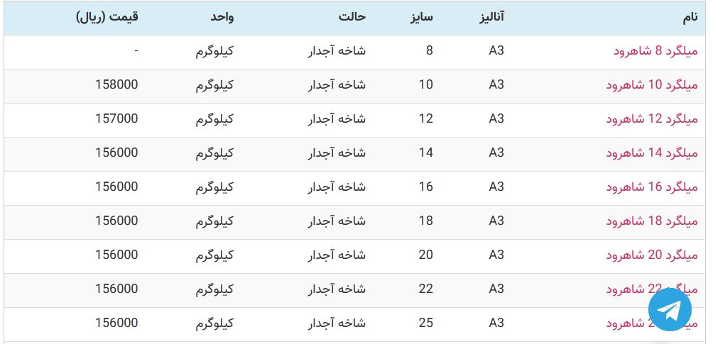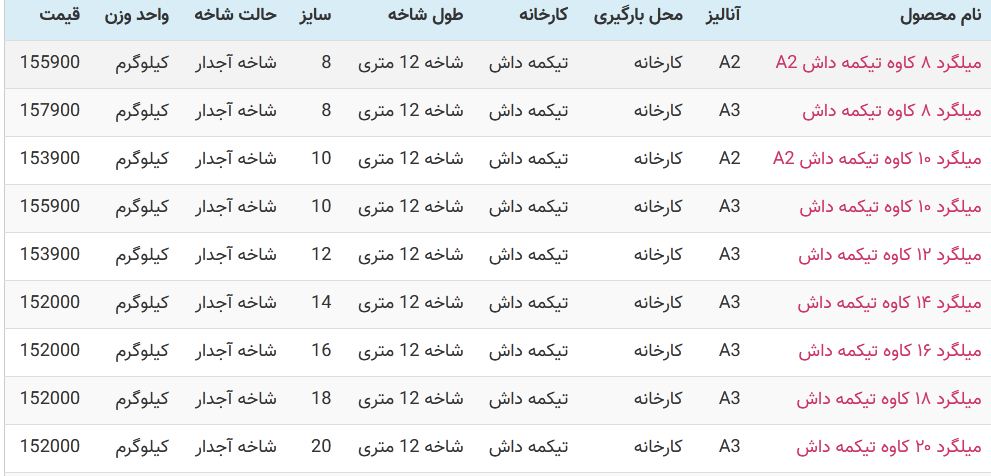 سه شنبه 1 تیر ماه 1400 📢 #قیمت_میلگرد_آجدار_کاوه_تیکمه_داش ⏺ بدون تغییر قیمت رد اکثر سایزها بارگیری از کارخانه میلگرد 8 A2 قیمت 👈 15640 میلگرد 10 ...