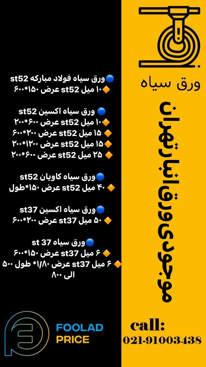 🔵 ورق سیاه اکسین st52 🔶۱۰ میل st52 عرض ۶۰۰*۲۰۰ 🔶 ۱۵ میل st52 عرض ۲۰۰*۶۰۰ 🔶۱۵ میل st52 عرض ۱۲۰۰*۲۰۰ 🔵ورق سیاه کاویان st52 🔶 ۴۰ میل st52 عرض ۱۵۰*طول 🔵ورق سیا ...