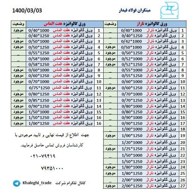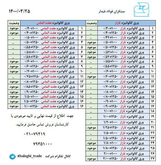 #بازرگانی_فولاد_خالقی ورق گالوانیزه هفت الماس موجود در کارخانه ۰.۴۰*۱۰۰۰ ۰.۴۰*۱۲۵۰ ۰.۵۰*۱۲۵۰ ۰.۶۰*۱۰۰۰ ۰.۶۰*۱۲۵۰ ۱.۵*۱۰۰۰ ۱.۵*۱۲۵۰ موجودی گالوانیزه تاراز : ۰ ...