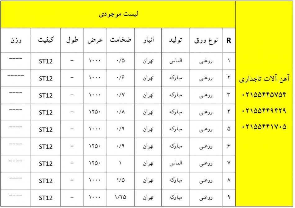 ورق روغني مباركه ضخامت ٠/٧٠ عرض ١٠٠ St12 آبي تهران ورق روغني غرب ضخامت ٠/٤٠ ٠/٤٦ ٠/٤٨ عرض ١٠٠ تهران ورق روغني مباركه سبدي ضخامت ٠/٨٠ عرض ٨١ ضخامت ٠/٨٠ عرض ١ ...
