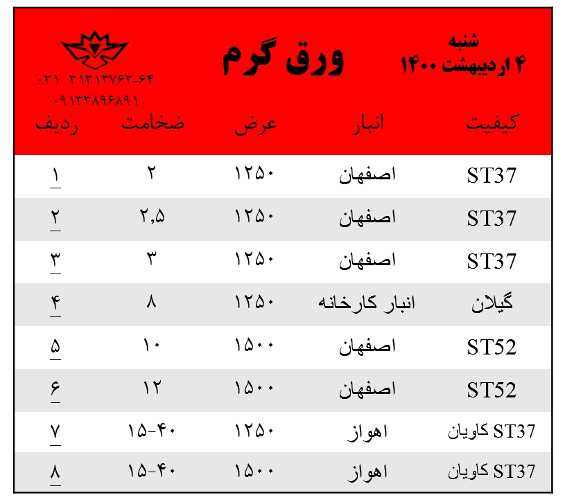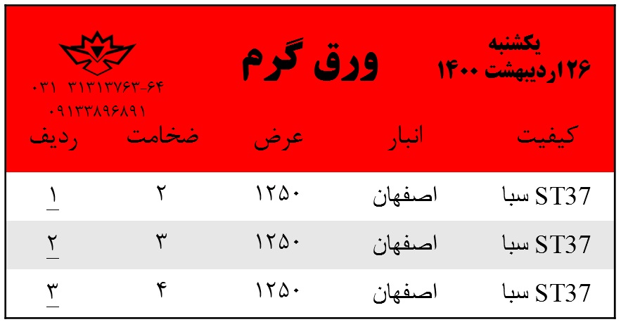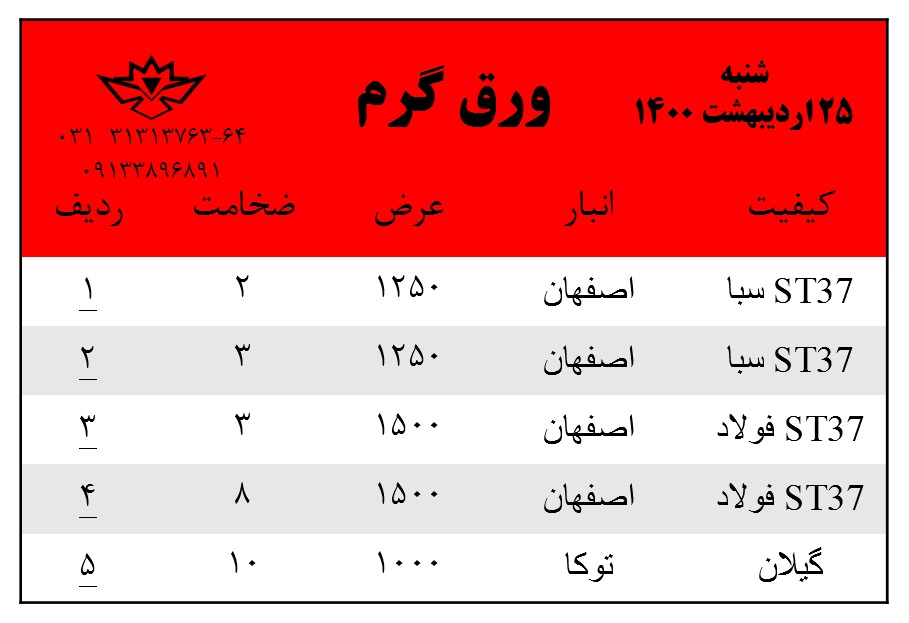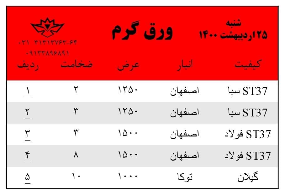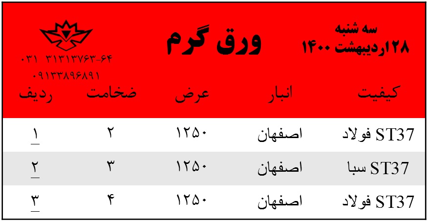 با سلام. موجودی ورق گرم روز شنبه 25 اردیبهشت ماه 1400 جهت استعلام قیمت ها با شماره های زیر تماس بگیرید: 031-31313763 031-31313764 0913-3896891