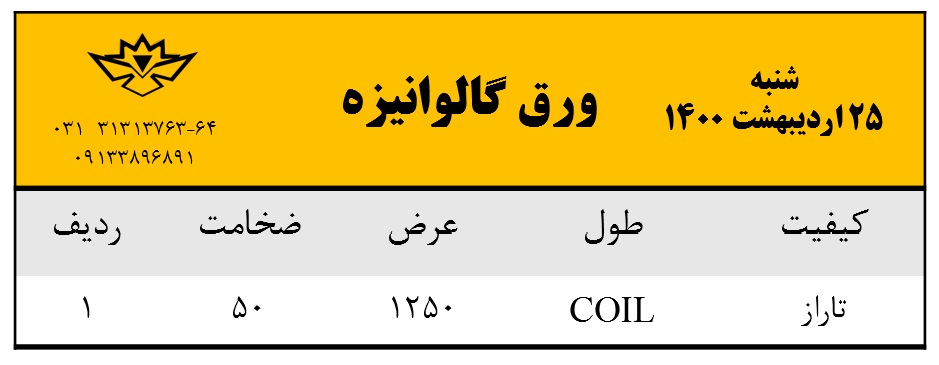 با سلام. موجودی ورق گالوانیزه روز شنبه 25 اردیبهشت ماه 1400 جهت استعلام قیمت ها با شماره های زیر تماس بگیرید: 031-31313763 031-31313764 0913-3896891