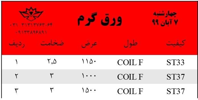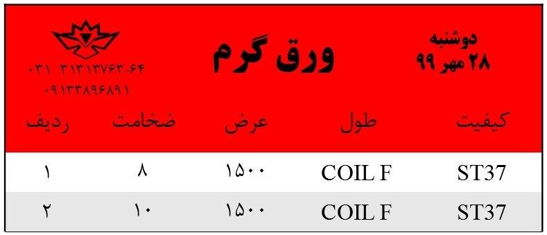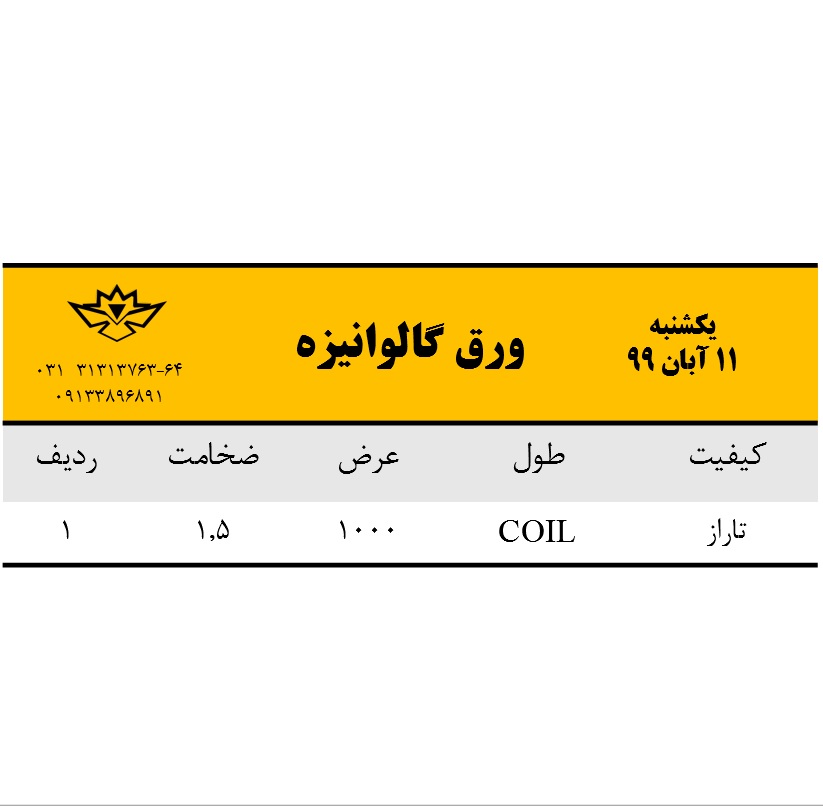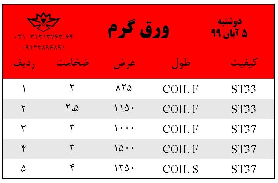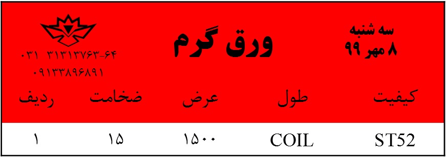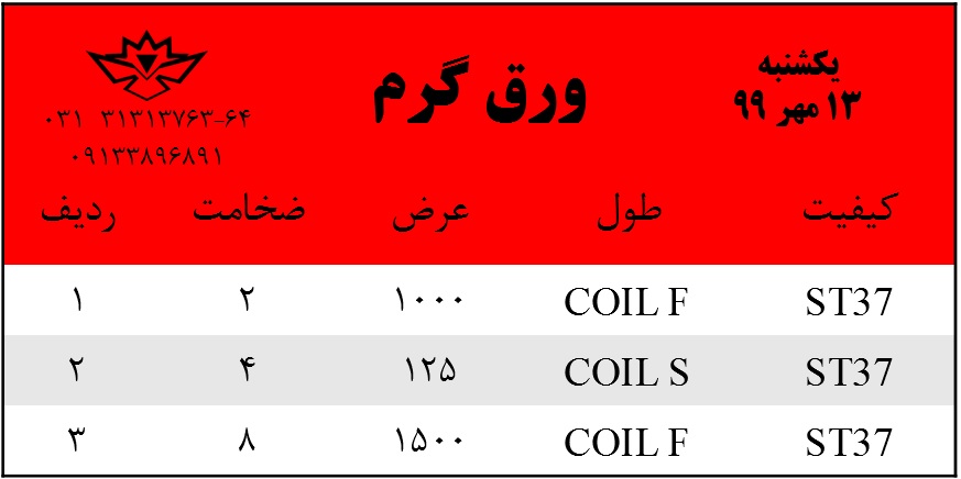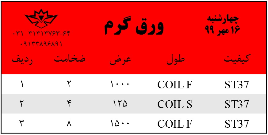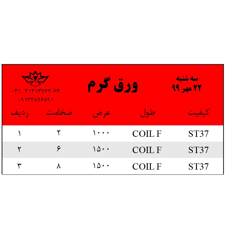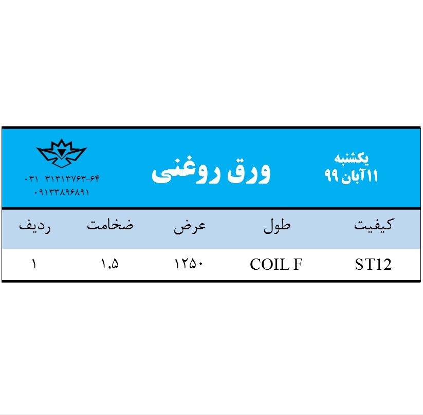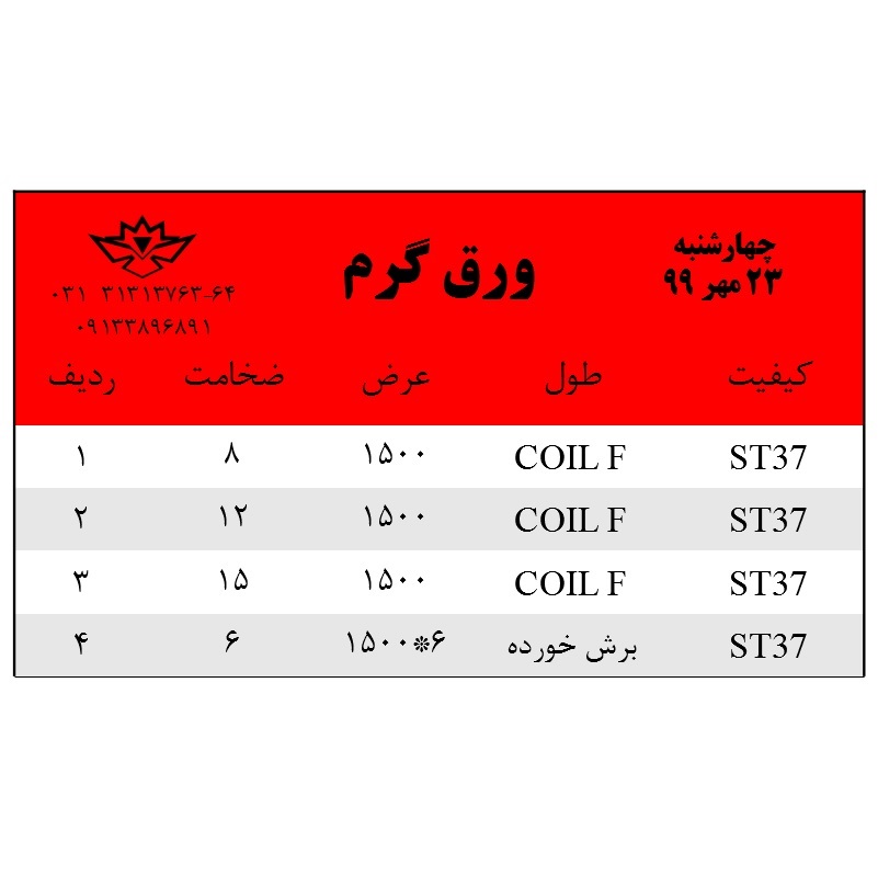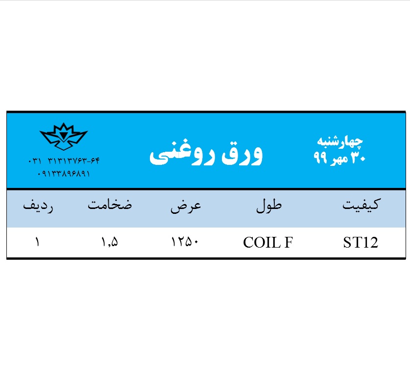 🔴شرکت بازرگانی #مهربد_تدبیر_زرین 🔴 صورت بار امروز👇🏻👇🏻 🔹ورق روغنی ۱.۵ عرض ۱۲۵۰ فولاد 📱09133896891 ☎️031-31313764 ☎️031-31313763