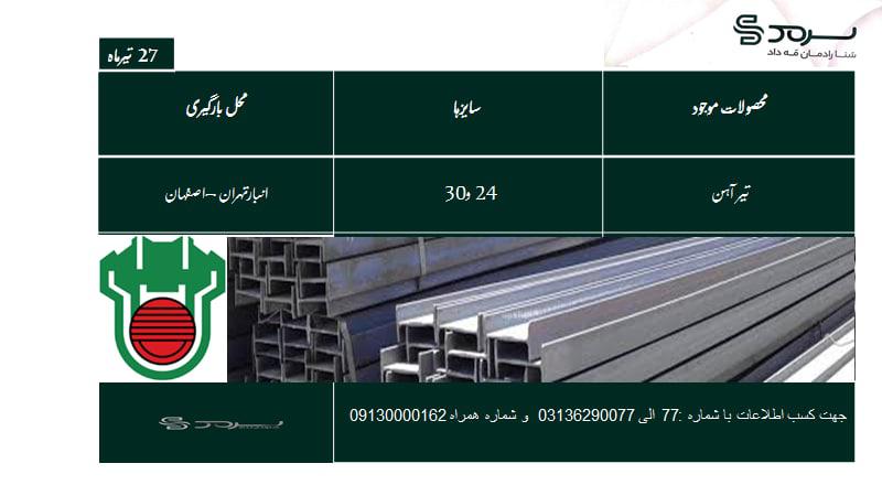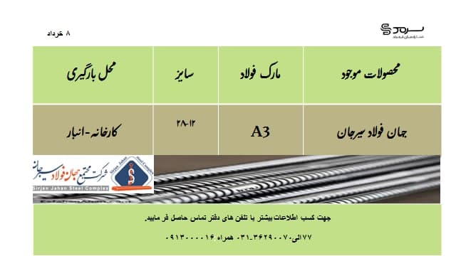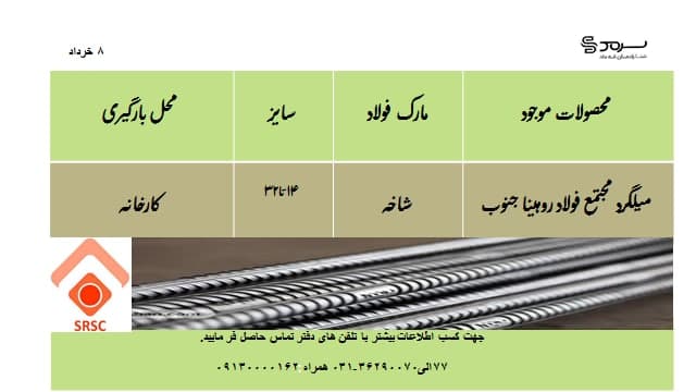 شنبه ١۴٠٠/٠۳/۰۸ 🔅با سلام و روز بخیر🔅 لیست موجودی #میلگرد کارخانه #مجتمع فولاد روهینا جنوب # تحویلی درب کارخانه تلفن تماس :36291454-031