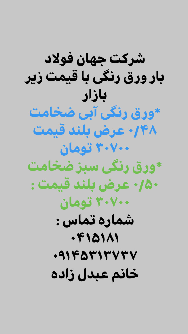 شرکت جهان فولاد بار ورق رنگی با قیمت زیر بازار *ورق رنگی آبی ضخامت ۰/۴۸ عرض بلند قیمت ۳۰۷۵۰ تومان *ورق رنگی سبز ضخامت ۰/۵۰ عرض بلند قیمت : ۳۰۷۰۰ تومان شماره ...