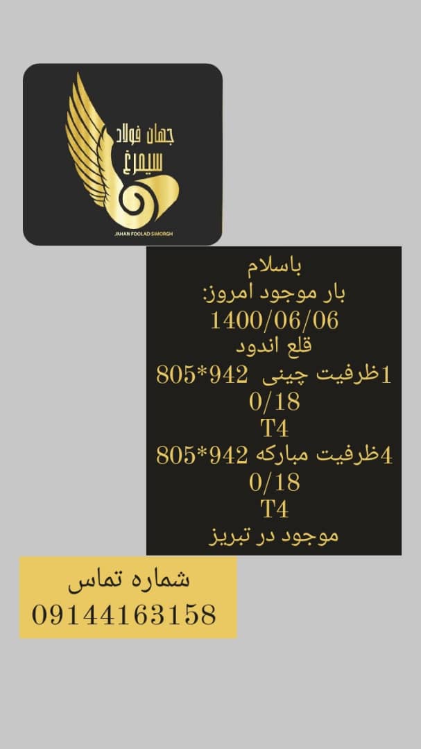 باسلام موجودی بار امروز: روغنی 70×1000 st12 1×1000 st12 70×1250 st12 80×1000 st12 انبار اصفهان فولاد مبارکه 09144163158