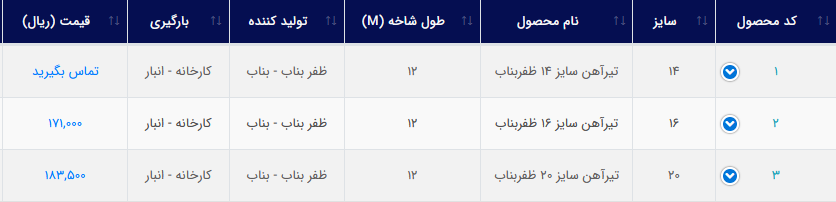 تیرآهن ۱۴ ۱۷۷۵۰۰ ﷼ تیرآهن ۱۶ ۱۷۱۰۰۰ ﷼ تیراهن۲۰ ۱۸۵۵۰۰ ﷼ ☑️ بارگیری ۱۰ روزه شماره تماس : ۰۴۱ ۳۵۵۹۵۰۰۵ ۰۴۱ ۳۵۵۹۵۰۰۴ ۰۴۱ ۳۵۵۹۵۰۰۳