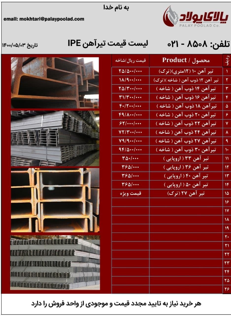 تیرآهن مرجع تخصصی توزیع آهن آلات اعلام قیمت 8508-021 مدیر فروش : مجتبی مختاری داخلی 400و401
