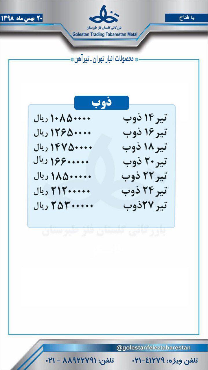 98/11/19 لیست قیمت شماره یک شرکت قطب آهن آسیا با سلام لیست قیمت هاش های سبک_سنگین و تیرآهن در انبار تهران هاش 10 سبک 11800 هاش 12 سبک 12000 هاش 12 سنگین 12000 هاش 16 سبک ذوبی 8900 هاش 18 سبک ذوبی 6900 هاش 20 سبک ترک 8500 هاش 20 سنگین ترک 8500 هاش 22 سبک 12500 هاش 22 سنگین 13000 هاش 24 سبک 14500 هاش 24 سنگین 13000 هاش 26 سنگین 11500 هاش 28 سنگین 13000 هاش 30 سبک 13500 هاش 30 سنگین کره 9400 هاش 40 سنگین 13000 هاش 50 سنگین 13000 هاش 60 سبك كره 13000 تیرآهن 33 کوتاه 12000 تیرآهن 12700 33 تیرآهن 12700 36 شرکت قطب آهن آسیا توزیع کننده هاش های سبک و سنگینناودانی های هم وزن اروپا فایکو و تبریزناودانی های اروپائی درصورت نیاز با فاکتور رسمی با دفتر شرکت تماس حاصل نمائید. شماره تلفن ویژه این شرکت: 48495 09123751604 حامد دوست 09121984313 حاج رسول دوست لینک کانال این شرکت: T.me/GHOTBEAHANEASIA