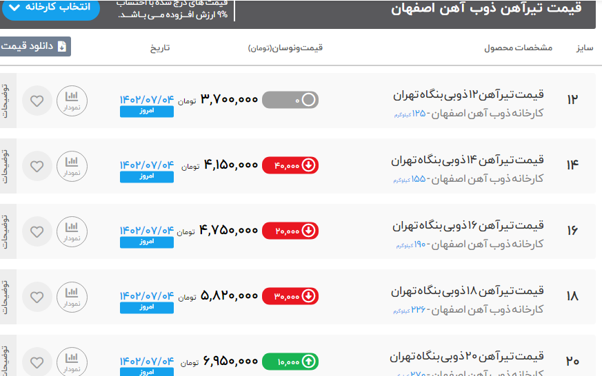 #رادین_پولاد_توسن_اسپادانا ⚜️#قیمت_میلگرد_کیان_کاشان میلگرد8____258.000ریال میلگرد10____255.000ریال میلگرد12____255.000ریال میلگرد14____253.000ریال میلگرد16____253.000ریال ⚜️#قیمت_میلگرد_راد_همدان میلگرد8____270.750ریال میلگرد10____267.750ریال میلگرد12____261.750ریال میلگرد14____258.750ریال میلگرد16____258.750ریال میلگرد18____258.750ریال میلگرد20___258.750ریال میلگرد22____258.750ریال میلگرد25___259.250ریال میلگرد28___259.250ریال ⚜️#قیمت_تیر_ذوب تیرآهن 12_____290.000ریال تیرآهن 14_____274.000ریال تیرآهن 16____252.000ریال تیرآهن 18____253.000ریال تیرآهن 20____255.000ریال تیرآهن 22____254.000ریال تیرآهن 24____256.000ریال تیرآهن 27____253.000ریال تیرآهن 30____271.000ریال ⚜️#قیمت_تیر_ذوب_i7 تیرآهن 14 ____40.500.000ریال تیرآهن 16 ____47.000.000ریال تیرآهن 18 ____57.500.000ریال تیرآهن 20 ____68.000.000ریال 📌شماره های تماس : ☎️03134036 📱09925008927 📱09925008944 📱09925008932 📱09925008922 📌لینک های مرتبط با ما:👇🏻👇🏻 🔰لینک وبسایت توسن فولاد (https://tosanfoolad.com/)🔰لینک کانال توسن فولاد 🔰 (https://t.me/tosan_foolad)لینک اینستاگرام توسن فولاد https://foolad24.com/dashboard/user/14665