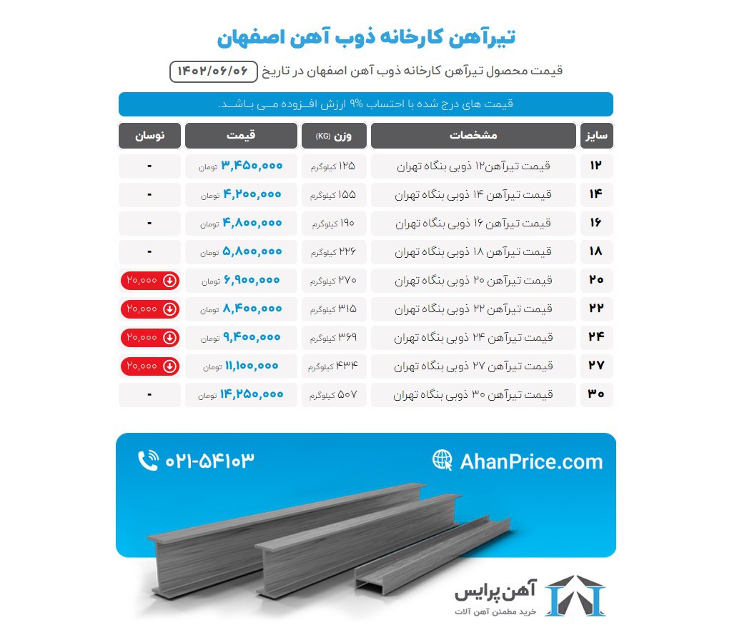 🔸تیر ۱۲ ذوب آهن:۳۴٫۵۰۰٫۰۰۰﷼ 🔸تیر ۱۴ذوب آهن :۴۲٫۰۰۰٫۰۰۰﷼ 🔸تیر ۱۶ذوب آهن :۴۸٫۰۰۰٫۰۰۰﷼ 🔸تیر ۱۸ذوب آهن :۵۸٫۰۰۰٫۰۰۰﷼ 🔸تیر ۲۰ ذوب آهن :۶۹٫۰۰۰٫۰۰۰﷼ 🔸تبر ۲۲ ذوب آهن:۸۴٫۰۰۰٫۰۰۰﷼ 🔸تیر ۲۴ ذوب آهن :۹۴٫۰۰۰٫۰۰۰﷼ 🔸تیر ۲۷ ذوب آهن :۱۱۱٫۰۰۰٫۰۰۰﷼ 🔸تیر ۳۰ذوب آهن: ۱۴۲٫۵۰۰٫۰۰۰﷼
