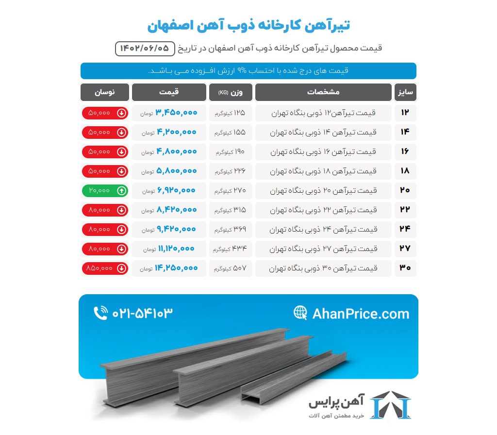 🗓 امروز یکشنبه ۰۵ شهریور ماه ۱۴۰۲ ✅قیمت انواع محصولات فولادی (بنگاه اصفهان) ✅قیمت ها با تایید میباشد. (انبار آهن آلات پورجم با باسکول تمام. الکترونیک 60تنی) راه های ارتباطی با ما : 0314202 03133869211 03133869212🟥 www.ahanjam.com 🟥 تیر آهن ذوب آهن 12 35,000,000 تیر آهن ذوب آهن 14 41,500,000 تیر آهن ذوب آهن 16 48,000,000 تیر آهن ذوب آهن 18 58,000,000 تیر آهن ذوب آهن20 69,500,000 تیر آهن ذوب آهن22 84,000,000 تیر آهن ذوب آهن24 94,000,000 تیر آهن ذوب آهن27 111,000,000 تیر آهن ذوب آهن30 138,000,000 ✅ کلیه محصولات، بارگیری سریع، آماده ارسال#آهن_جم #آهن_آلات_پورجم #تیرآهن_ذوبی #قیمت_تیرآهن