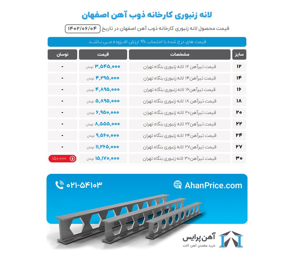 🗓️ یکشنبه 1402/06/05 ☑️تیرآهن ذوب آهن 📍سایز 12 ⬅️ تماس بگیرید 📍سایز 14 ⬅️ 4.150.000 📍سایز 16 ⬅️ 4.800.000 📍سایز 18 ⬅️ 5.800.000 📍سایز 20 ⬅️ 7.000.000 📍سایز 22 ⬅️ 8.400.000 📍سایز 24 ⬅️ 9.400.000 📍سایز 27 ⬅️ 11.100.000 📍سایز 30 ⬅️ 14.000.000 🚚بارگیری از انبار اصفهان 📣 کلیه قیمت ها با تایید 🏗️شرکت فولاد سعادت پاسارگاد (اصفهان) 031_35493211 09136021271 ☎️https://t.me/fooladsaadat