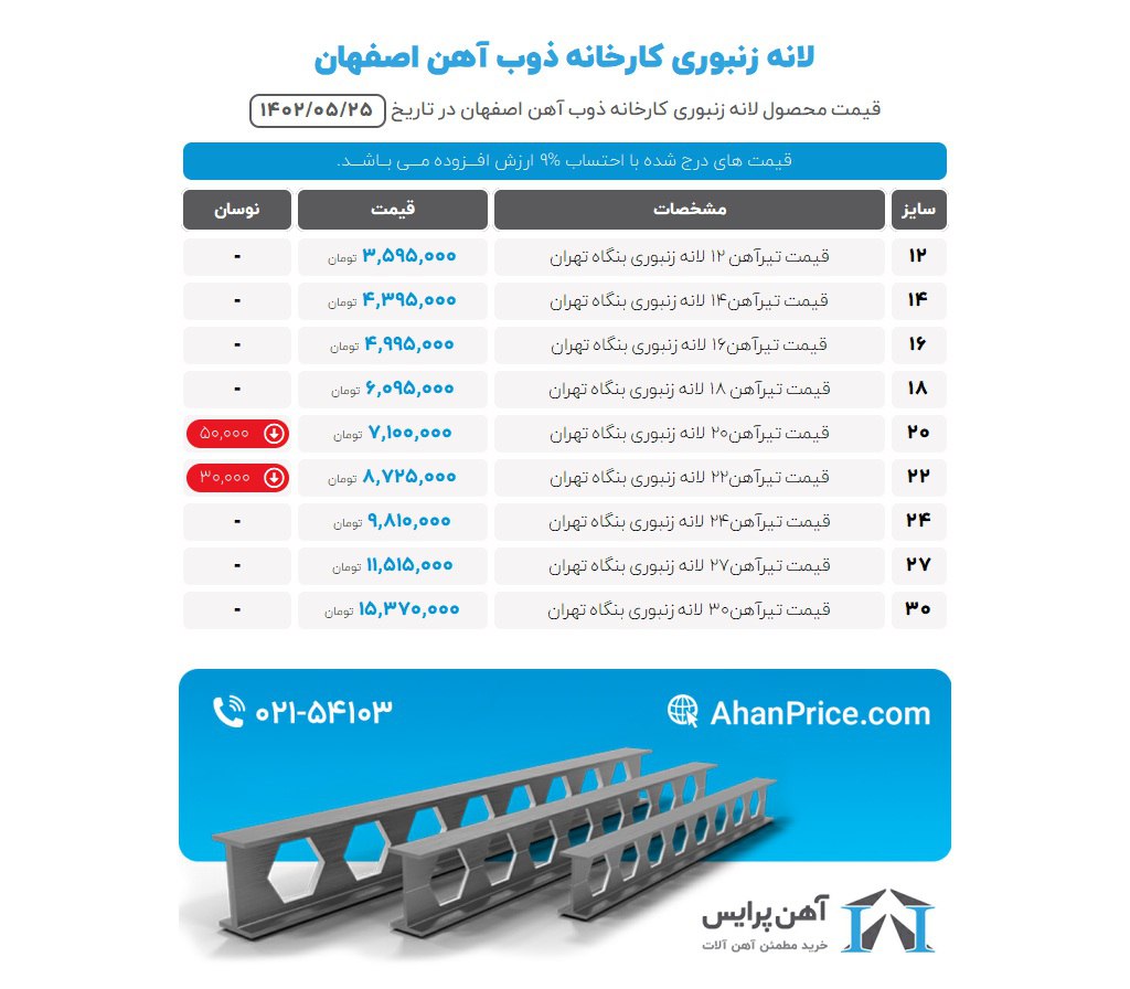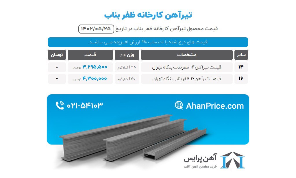 لیست قیمت آهن آلات چهارشنبه 25 مرداد 1402قیمت تیرآهن • تیرآهن 14 اصفهان | 4,390،000 • تیرآهن 16 اصفهان | 5,050،000 • تیرآهن 18 اصفهان | 6،150،000 • تیرآهن 20 اصفهان | 7،300،000 • تیرآهن 22 اصفهان | 8.900.000 • تیرآهن 24 اصفهان| 9،850،000 • تیرآهن 27 اصفهان| 11،800،000 • تیرآهن 30 اصفهان| 15،200،000تیرآهن سبک • تیرآهن 14 I7 اصفهان | تماس • تیرآهن 16 I7 اصفهان | تماس • تیرآهن 18 I7 اصفهان | تماس • تیرآهن 20 یزد | تماسقیمت میلگرد میلگرد 8 A3 | 27،200 میلگرد 10 A3 | 26,800 میلگرد 12 غیر نیشابور 26.200 | A3 میلگرد 14 تا 28 | 25.200ورقورق فولاد | 34.000 ورق گیلان | 32.000 ورق تهران | 29.000 باتوجه به نوسان قیمت (کاهش یا افزایش) جهت دریافت قیمت نهایی تماس بگیرید.تخفیف روی خط 09150020099 051363605136903006 05136903005 https://zil.ink/bonyanfoulad.ghavam