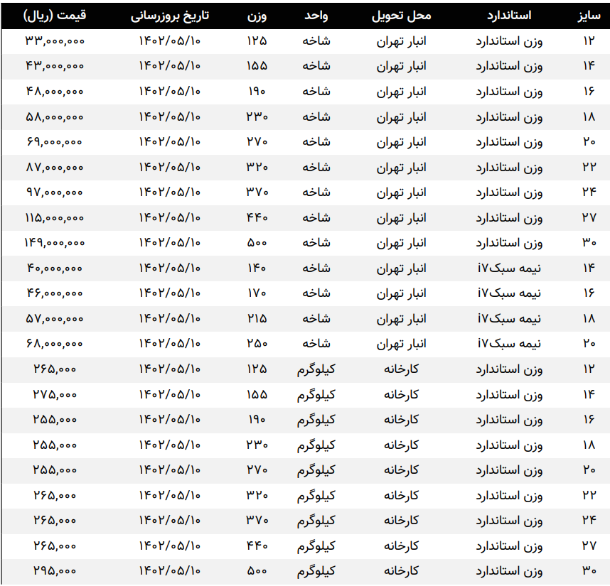 آرمان گستر اقتدار (آهن آرمان) 👈 ضمانت یک خرید مطمئن👉 #قیمت روز انواع #تیرآهن #ترک #وارداتی #هاش #بالپهن #HEB #HEA #IPE 🗓 سه شنبه، 10 مرداد 1402 🗓 . 📢قیمت روز تیرآهن ذوبی IPE (هرکیلوگرم) از انبار تهران📢 🔸 تیرآهن 12 (125کیلو): 33.500.000 ريال 🔸 تیرآهن 14 (155کیلو): 41.600.000 ريال 🔸 تیرآهن 16 (190کیلو): 47.800.000 ريال 🔸 تیرآهن 18 (225کیلو): 57.500.000 ريال 🔸 تیرآهن 20 (270کیلو): 68.600.000 ريال 🔸 تیرآهن 22 (310کیلو): 86.200.000 ريال 🔸 تیرآهن 24 (360کیلو): 97.500.000 ريال 🔸 تیرآهن 27 (430کیلو): 115.200.000 ريال 🔸 تیرآهن 30 (500کیلو): 149.500.000 ريال . 📢قیمت روز تیرآهن ذوبی IPE (هرکیلوگرم) از اصفهان📢 🔸 تیرآهن 12 (12کیلو): ء call 🔸 تیرآهن 14 (155کیلو): ء call 🔸 تیرآهن 16 (190کیلو): ء call 🔸 تیرآهن 18 (225کیلو): ء call 🔸 تیرآهن 20 (270کیلو): ء call 🔸 تیرآهن 22 (310کیلو): ء call 🔸 تیرآهن 24 (360کیلو): ء call 🔸 تیرآهن 27 (430کیلو): ء call 🔸 تیرآهن 30 (500کیلو): ء call ~~~~~~~~~~~~~~~~~~ ☎️۰۲۱-۵۸۳۳۶ داخلی 115 خانم گل پرور 🌐www.ahanarman.com وب سایت @AhanArmanPrice🆔 کانال قیمت روز تلگرام
