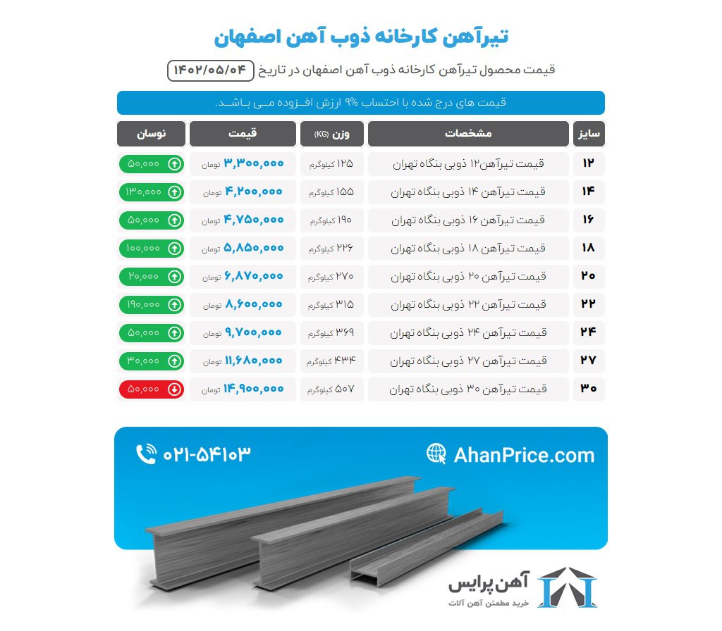 محصول قیمت (با مالیات) چهارشنبه 1402/05/04 تیرآهن 12 ذوب آهن 12 متری انبار تهران 3,300,000 تیرآهن 14 ذوب آهن 12 متری انبار تهران 4,250,000 تیرآهن 16 ذوب آهن 12 متری انبار تهران 4,800,000 تیرآهن 18 ذوب آهن 12 متری انبار تهران 5,830,000 تیرآهن 20 ذوب آهن 12 متری انبار تهران 6,870,000 تیرآهن 22 ذوب آهن 12 متری انبار تهران 8,620,000 تیرآهن 24 ذوب آهن 12 متری انبار تهران 9,710,000 تیرآهن 27 ذوب آهن 12 متری انبار تهران 11,680,000 تیرآهن 30 ذوب آهن 12 متری انبار تهران 14,900,000 تیرآهن 12 ذوب آهن بنگاه اصفهان 3,400,000 تیرآهن 14 ذوب آهن بنگاه اصفهان 4,200,000 تیرآهن 16 ذوب آهن بنگاه اصفهان 4,800,000 تیرآهن 18 ذوب آهن بنگاه اصفهان 5,750,000 تیرآهن 20 ذوب آهن بنگاه اصفهان 6,850,000 تیرآهن 22 ذوب آهن بنگاه اصفهان 8,600,000 تیرآهن 24 ذوب آهن بنگاه اصفهان 9,600,000 تیرآهن 27 ذوب آهن بنگاه اصفهان 11,400,000 تیرآهن 30 ذوب آهن بنگاه اصفهان 14,410,000 📡 راه های ارتباطی در دیجی اهن: ☎️ شماره تماس: شماره چهار رقمی تهران 1849 شهرستانها 02186020094 instagram.com/digi.ahan :اینستاگرام🆔 🌐وبسایت: www.digiahan.com ✅تلگرام: https://t.me/Digiahan1849