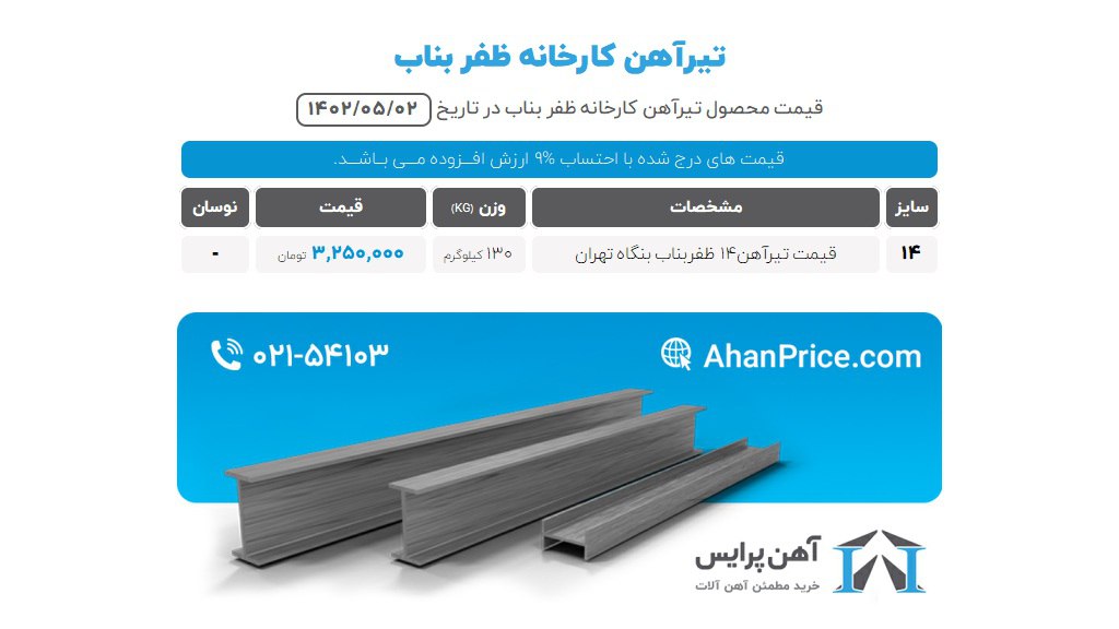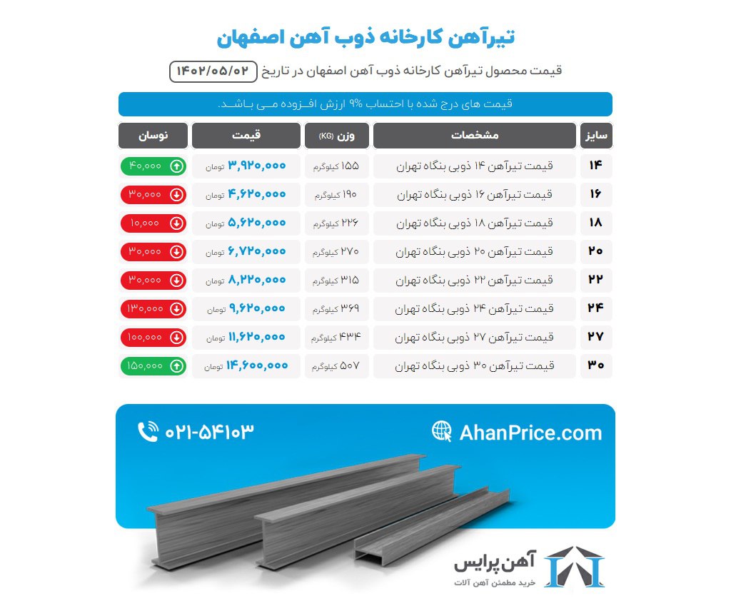 تیرآهن ذوب آهن سایز 12 (125کیلوگرم) = 3.300.000 سایز 14 (155کیلوگرم) = 4.000.000 سایز 16 (190کیلوگرم) = 4.700.000 سایز 18 (230 کیلوگرم) = 5.700.000 سایز 20 (270 کیلوگرم) = 6.800.000 سایز 22 (320 کیلوگرم) = 8.300.000 سایز 24 (370 کیلوگرم) = 9.700.000 سایز 27 (440 کیلوگرم) = 11.700.000 سایز 30 (500 کیلوگرم) = 15.000.000 قیمت i7 تلفنی اعلام میگردد. 🧨 تخفیف هنگام خرید قطعی ☎️ 211 / 210 280 45 📳 88 59 106 - 0994 🤞کارشناس تامین پاتریس
