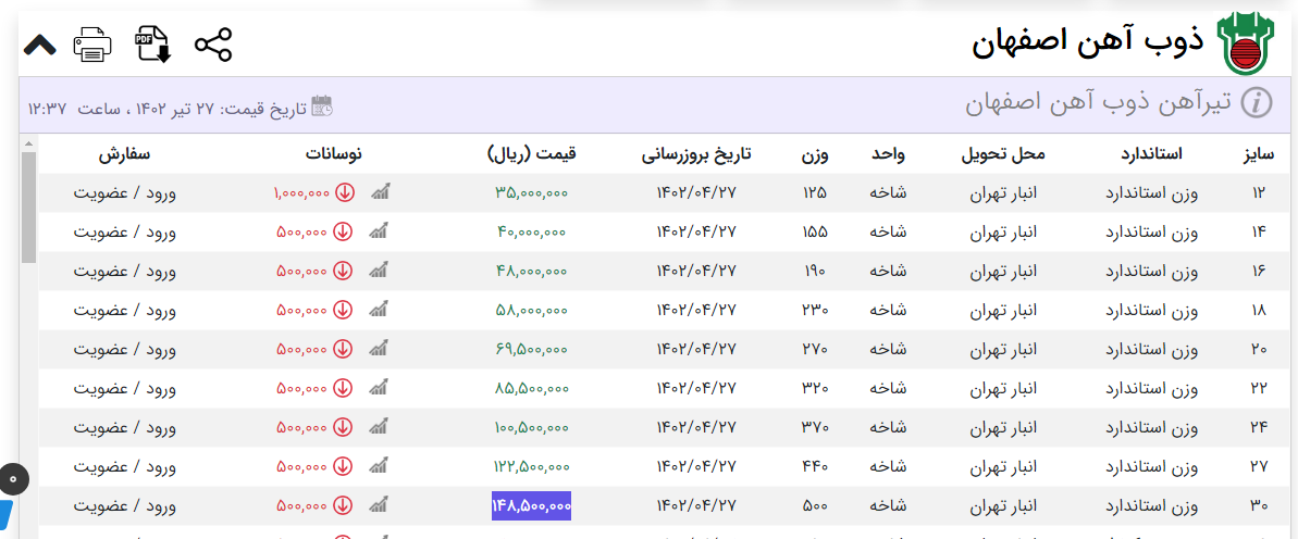 #تیرآهن_ذوبی_ شاخه انبار اصفهان تیر۱۲ ۳۷۰۰۰۰۰۰ ریال تیر۱۴ ۴۱۰۰۰۰۰۰ ریال تیر۱۶ ۵۰۰۰۰۰۰۰ ریال تیر۱۸ ۶۰۰۰۰۰۰۰ ریال تیر۲۰ ۷۲۰۰۰۰۰۰ ریال تیر۲۲ ۸۸۰۰۰۰۰۰ ریال تیر۲۴ ۱۰۲۰۰۰۰۰۰ ریال تیر۲۷ تلفنی تیر۳۰ تلفنیقیمت ها با تخفیف تلفنی