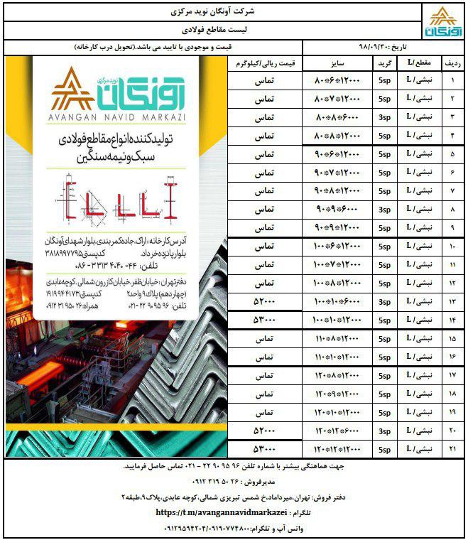 نبشي_ناوداني #كارخانه نبشي ٢/٥_____ نبشي ٣_____ نبشي ٤/٣_____ نبشي ٤/٤_____٥٢١٠٠ نبشي ٥/٣_____٥٢٦٠٠ نبشي ٥/٤_____٥٢١٠٠ نبشي ٥/٥_____٥١٦٠٠ نبشي ٦/٣_____٥٣١٠٠ نبشي ٦/٤_____٥٢٦٠٠ نبشي ٦/٥_____٥٢١٠٠ نبشي ٦/٦_____٥١٦٠٠ نبشي ٧/٥_____ نبشي ٧/٦_____٥٤١٠٠ نبشي ٧/٧_____ نبشي ٨/٦_____٥٢١٠٠ نبشي ٨/٧_____٥١٦٠٠ نبشي ٨/٨_____٥٣١٠٠ نبشي ١٠/٧_____٥٣١٠٠ نبشي ١٠/٨_____٥٣١٠٠ نبشي ١٠/١٠_____٥١١٠٠ ناوداني ٨_____ ناوداني ١٠_____٥٢١٠٠ ناوداني ١٢_____ ناوداني ١٤_____٥٢١٠٠ ناوداني ١٦_____٥٢١٠٠ با فاكتور رسمي ميباشد جهت دريافت قيمت محصولات ١٢ متري تماس حاصل فرماييد