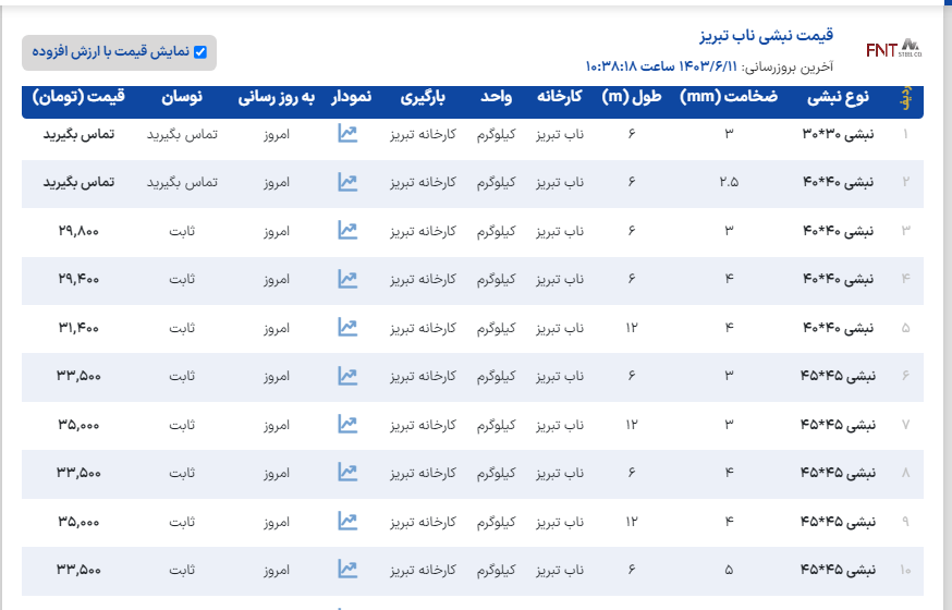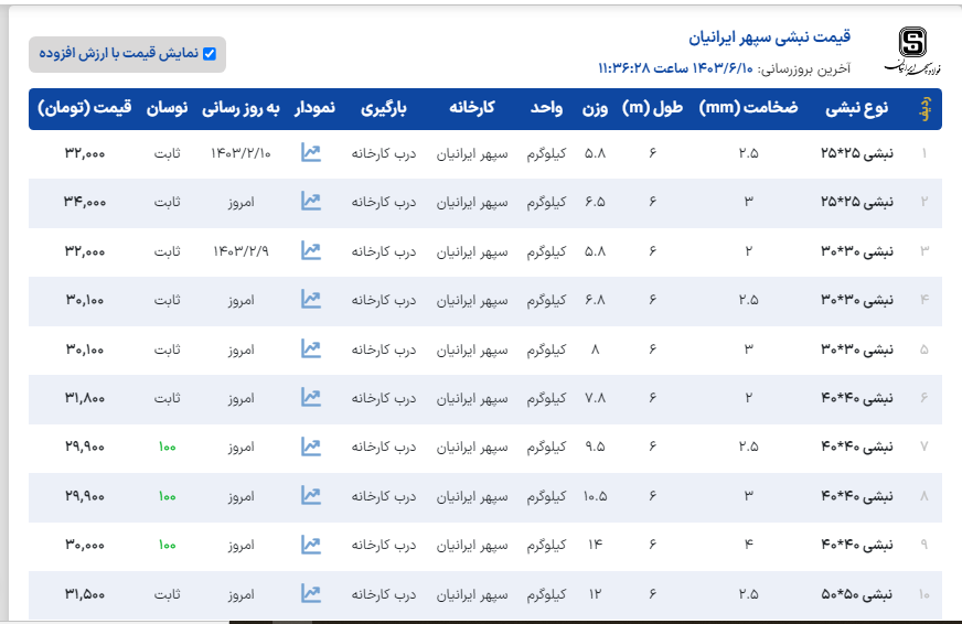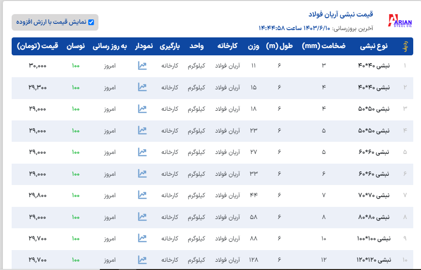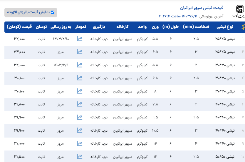 ﷽ آهن ایران 📣قیمت نبشی آرین 🚚بارگیری از کارخانه یکشنبه 11 شهریور ...................................................................................................................................... نبشی4گوشت3👈30.150 نبشی4گوشت4👈29.250 نبشی5گوشت5👈29.200 نبشی6گوشت5👈29.200 نبشی6گوشت6👈29.200 نبشی7گوشت7👈30.000 نبشی8گوشت8👈29.200 نبشی10گوشت10👈29.900 نبشی12گوشت12👈29.900 ✅فروش یکماهه با چک معتبر ثبتی ✅کلیه قیمتها با احتساب 10% مالیات بر ارزش افزوده می باشد ........................................................................................................................................ ☎️031-33330900☎️ دفتر مرکزی اصفهان ☎️031-33330400☎️ آهن ایران