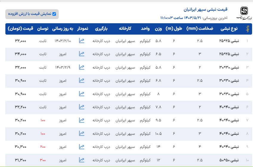یکشنبه ۲۱ / مرداد / ۱۴۰۳ 🗓 🔸استعلام قیمت با تماس تلفنی 🔸 💠تمامی محصولات با فاکتور رسمی 💠 موجودی نبشی انبار تهران نبشی ۳ اسپیرال اصفهان ( ۸ ك) نبشی ۳ شکفته سنگین ( ۸ ك) نبشی ۳ ظهوریان ( ۷ ك) نبشی ۳ آی هان تهران ( ۷ ك) نبشی ۳ نستا ( ۷ ك) نبشی ۳ سپهر ( ۷ ك) نبشی ۴ اسپیرال اصفهان ( ۱۴ ك) نبشی ۴ شکفته ( ۱۰/۵ ك) نبشی ۴ شکفته سنگین( ۱۴ ك) نبشی ۴ ظهوریان مشهد ( ۱۰/۵ ك) نبشی ۴ فولاد پارسه ( ۹ ك) نبشی ۴ فولاد سپهر ( ۹ ك) نبشی ۴ سپهر فوق سبک ( ۹ ك) نبشی ۴ نستا ( ۹/۵ ك) نبشی ۴ نستا سبک ( ۸ ك) نبشی ۴ ابهر ( ۱۴ ك) نبشی ۴ آریان فولاد ( ۱۴ ك) نبشی ۴ ناب تبریز ( ۱۴ ك) نبشی ۵ گ۳ ظهوریان ( ۱۵ ك) نبشی ۵ گ۳ شکفته ( ۱۵ ك) نبشی ۵ گ ۴ زنجان ( ۱۸ ك) نبشی ۵ گ ۵ زنجان ( ۲۲ ك) نبشی ۵ گ ۴ آریان فولاد ( ۱۸ ك) نبشی ۵ آریان فولاد ( ۲۲ ك) نبشی ۵ گ ۴ ناب تبریز ( ۱۹ ك) نبشی ۵ گ۵ ماهان ذوب ( ۲۲ ك) نبشی ۵ گ ۴ ماهان ذوب ( ۱۹ك) نبشی ۶ گ ۵ شکفته ( ۲۷ ك) نبشی ۶ ظهوریان مشهد ( ۳۱ ك) نبشی ۶ آریان فولاد ( ۳۲ ك) نبشی ۶ گ ۵ آریان فولاد ( ۲۷ ك) نبشی ۶ زنجان ( ۳۱ ك) نبشی ۶ گ۴ زنجان ( ۲۳ ك) نبشی ۶ گ۵ زنجان ( ۲۷ ك) نبشی ۷ شکفته ( ۴۳ ك) نبشی ۷ آریان فولاد ( ۴۴ ك) نبشی ۸ گ۷ شکفته ( ۵۰ ك) نبشی ۸ آریان فولاد ( ۵۶ ك) نبشی ۸ گ ۷ ظهوریان ( ۵۰ ك) نبشی ۸ فولاد اشتهارد ( ۵۶ ك) نبشی ۸ حافظ یزد ( ۵۶ ك) نبشی ۸ آونگان اراک ( ۵۷ ك) نبشی ۸ ماهان ذوب ( ۵۶ ك) نبشی ۹ گ۸ ناب تبربز ( ۶۷ ك) نبشی ۱۰ شکفته ( ۸۰ ك) نبشی ۱۰ آریان فولاد ( ۸۸ ك) نبشی۱۰ اشتهارد ( ۸۶ ك) نبشی ۱۰ نورد آریا تابان ( ۸۸ ك) نبشی۱۰ حافظ یزد ( ۸۳ ك) نبشی۱۰ گ۸ اشتهارد ( ۷۵ ك) نبشی ۱۲ شکفته ( ۱۲۵ ك) نبشی ۱۲ آریان فولاد ( ۱۳۰ ك) نبشی ۱۲ صبا استیل ( ۱۲۳ ك) نبشی ۱۲ آونگان اراک ( ۱۲۸ ك) نبشی ۱۴ بلند آریان فولاد نبشی ۱۵ بلند آریان فولاد نبشی ۲۰ بلند آریان فولاد