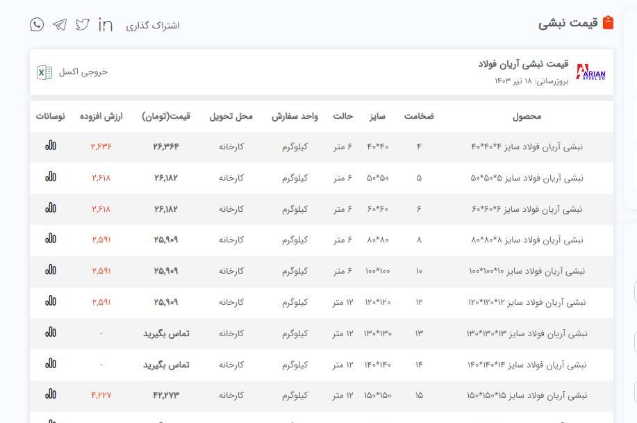 🟠 شرکت #پارس_مواد_نقش_جهان تیر ذوبی شاخه 🔸تیر ۱۲ 39,050,000 ریال 🔸تیر ۱۴ 45,050,000 ریال 🔸تیر ۱۶ 55,550,000 ریال 🔸تیر ۱۸ 66,550,000 ریال 🔸تیر ۲۰ 86,050,000 ریال 🔸تیر ۲۲ 96,050,000 ریال 🔸تیر ۲۴ 106,500,000 ریال 🔸تیر ۲۷ 126,500,000 ریال 🔸تیر ۳۰ 159,500,000 ریال ——————————————————- میلگرد راد همدان 🔸میلگرد سایز 8 317,500 ریال 🔸میلگرد سایز 10 307,500 ریال 🔸میلگرد سایز 12 300,000 ریال 🔸میلگرد سایز 14-22 297,500 ریال 🔸میلگرد سایز 25-28 298,500 ریال ——————————————————- ورق کرومیت 🔸ورق کرومیت لاهور 296,000 ریال ——————————————————- نبشی _ فولاد آرین بوئین زهرا 🔸نبشی ۳*۴ 296,000 ریال 🔸نبشی ۴*۴ 287,000 ریال 🔸نبشی ۵ *۶ 286,500 ریال 🔸نبشی ۷*۷ 294,500 ریال 🔸نبشی ۸ 286,500 ریال 🔸نبشی ۱۰*۱۲ 293,500 ریال ————————————————— ورق ST37 _ فولاد کاویان 🔸ورق ۸ کاویان ۱.۲۵*۶ 🔸ورق ۱۰ کاویان ۱.۲۵*۶ 🔸ورق ۱۲ کاویان ۱.۲۵*۶ 🔸ورق ۱۵ کاویان ۱.۲۵*۶ 🔸ورق ۲۰ کاویان ۱.۲۵*۶ 🔸ورق ۲۵ کاویان ۱.۲۵*۶ 🔸ورق ۳۰ کاویان ۱.۲۵*۶ 🔸ورق ۳۵ کاویان ۱.۲۵*۶ 🔸ورق ۴۰ کاویان ۱.۲۵*۶ 🔹ورق 10 کاویان ۱.۵*۶ 🔹ورق 12 کاویان ۱.۵*۶ 🔹ورق 15 کاویان ۱.۵*۶ 🔹ورق 20 کاویان ۱.۵*۶ 🔹ورق 25 کاویان ۱.۵*۶ 🔹ورق 30 کاویان ۱.۵*۶ 🔹ورق 35 کاویان ۱.۵*۶ 🔹ورق 40 کاویان ۱.۵*۶ 🔹ورق 45 کاویان ۱.۵*۶ 🟠بارگیری از کارخانه ————————————————— #جهت_مشاهده_پروفایل_پارس_مواد_نقش_جهان https://foolad24.com/profile/17737 #جهت_مشاهده_اعلام_موجودی_پارس_مواد_نقش_جهان https://foolad24.com/profile/17737/inventory 📌 تامین کننده انواع مقاطع فولادی( میلگرد، نبشی، تیرآهن، ناودانی، لوله، ورق و ...) 📎 اطلاعات تماس: 📞 031-35058 🌐 parsferro.com ✉️ info@parsferro.com 🆔 @parsferro 🧭 اصفهان، خیابان مصلی شمالی(آب ۲۵۰)، ساختمان هدی، طبقه دوم، واحد ۸۸