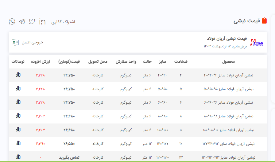 ✅ #شرکت_آسیا_فولاد_امین 🔵لیست نبشی و ناودانی🔵 ((انبار تهران)) 🔴1403/02/18🔴 #نبشی_سپهر 🔶نشی ۳ گوشت ۲/۵ سپهر:📞 #نبشی_آیهان 🔶نشی ۳ گوشت ۲/۵ آیهان:📞 #نبشي_اشتهارد 🔶نبشي 12 گوشت 12 اشتهارد:📞 🔶نبشی ۱۰ گوشت ۱۰ اشتهارد: 📞 #نبشی_پارسه 🔶نبشی ۴ گوشت ۳ پارسه : 📞 🔶نبشی ۴ گوشت ۴ پارسه : 📞 #نبشی_ظهوریان 🔶نبشی ۳ گوشت۳ ظهوریان:📞 🔶نبشی ۴ گوشت ۳ ظهوریان:📞 🔶نبشی ۵ گوشت ۳ ظهوریان:📞 🔶نبشي ٨ گوشت ۷ ظهوریان: 📞 #نبشی_شکفته 🔶نبشی ۳ گوشت ۳ شکفته:📞 🔶نبشی ۲/۵ شکفته:📞 #نبشی_آریان_فولاد 🔶نبشی ۴ گوشت ۳ آریان فولاد:📞 🔶نبشی ۴ گوشت ۴ آریان فولاد:📞 🔶نبشی۵ گوشت ۴ آریان فولاد:📞 🔶نبشی ۵ گوشت ۵ آریان فولاد:📞 🔶نبشی ۶ گوشت ۵ آریان فولاد:📞 🔶نبشی ۶ گوشت ۶ آریان فولاد:📞 🔶نبشی ۷ گوشت ۷ آریان فولاد:📞 🔶نبشی ۸ گوشت ۸ آریان فولاد:📞 🔶نبشی ۱۰ گوشت ۱۰ آریان فولاد:📞 🔶نبشی ۱۲ گوشت ۱۲ آریان فولاد:📞 🔶نبشی ۱۵ گوشت ۱۵ آریان فولاد:📞 #نبشی_دهشير_يزد 🔶نبشی 8 گوشت 8 دهشیر یزد:📞 🔶نبشی ۱۰ گوشت ۱۰ دهشیر یزد:📞 #نبشي_لقمه 🔶نبشی لقمه ۸ * ٨ :📞 🔶نبشي لقمه ١٠* ١٠ :📞