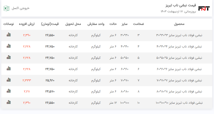 #نبشی_سپهر_ایرانیان 📆 تاریخ ⬅️ سه شنبه 18 اردیبهشت ماه 1403 🚚 بارگیری ⬅️از کارخانه 〽️تغییرات قیمت ⬅️ثابت مقاطع 6️⃣ متری: نبشی 2.5 ضخامت 2.5 (6.2 کیلوگرم) ⬅️ - تومان نبشی 2.5 ضخامت 3 (6 کیلوگرم) ⬅️ - تومان نبشی 3 ضخامت 2 (6 کیلوگرم) ⬅️ - تومان نبشی 3 ضخامت2.5 (7 کیلوگرم) ⬅️ - تومان نبشی 3 ضخامت3 (8 کیلوگرم) ⬅️ - تومان نبشی 3.5 ضخامت3 (11 کیلوگرم)⬅️ - تومان نبشی 3.5 ضخامت4 (12 کیلوگرم)⬅️ - تومان نبشی 4 ضخامت 2 (8.5کیلوگرم) ⬅️ 28000 تومان نبشی 4 ضخامت2.5 (9.5کیلوگرم)⬅️ 27500 تومان نبشی 4 ضخامت3 (11کیلوگرم) ⬅️ 27500 تومان نبشی 4 ضخامت4 (15 کیلوگرم) ⬅️ - تومان نبشی 5ضخامت 2.5 (15کیلوگرم) ⬅️ - تومان نبشی 5ضخامت 3 (15کیلوگرم) ⬅️ - تومان نبشی 5ضخامت 4 (19 کیلوگرم) ⬅️ - تومان نبشی 5ضخامت 5 (22کیلوگرم) ⬅️ - تومان نبشی6ضخامت 4 (23کیلوگرم) ⬅️ - تومان نبشی6ضخامت 5 (28کیلوگرم) ⬅️ - تومان نبشی6ضخامت6 (32کیلوگرم) ⬅️ - تومان نبشی8ضخامت 7 (50کیلوگرم) ⬅️ - تومان نبشی8ضخامت 8 (58کیلوگرم) ⬅️ - تومان نبشی 10 ضخامت 10 (90 کیلوگرم)⬅️ - تومان نبشی 12 ضخامت 12(120 کیلوگرم)⬅️ - تومان ❗️تمامی قیمت ها با احتساب 10% مالیات بر ارزش افزوده می باشد. ☑️ برای مشاوره و راهنمایی در مورد خرید لطفا با ما تماس بگیرید . ☎️ 02146132136 ☎️ 02146135390 📱09122887687 📱09107678174 🆔 @tgfonline 🌐 www.tarazfoolad.ir